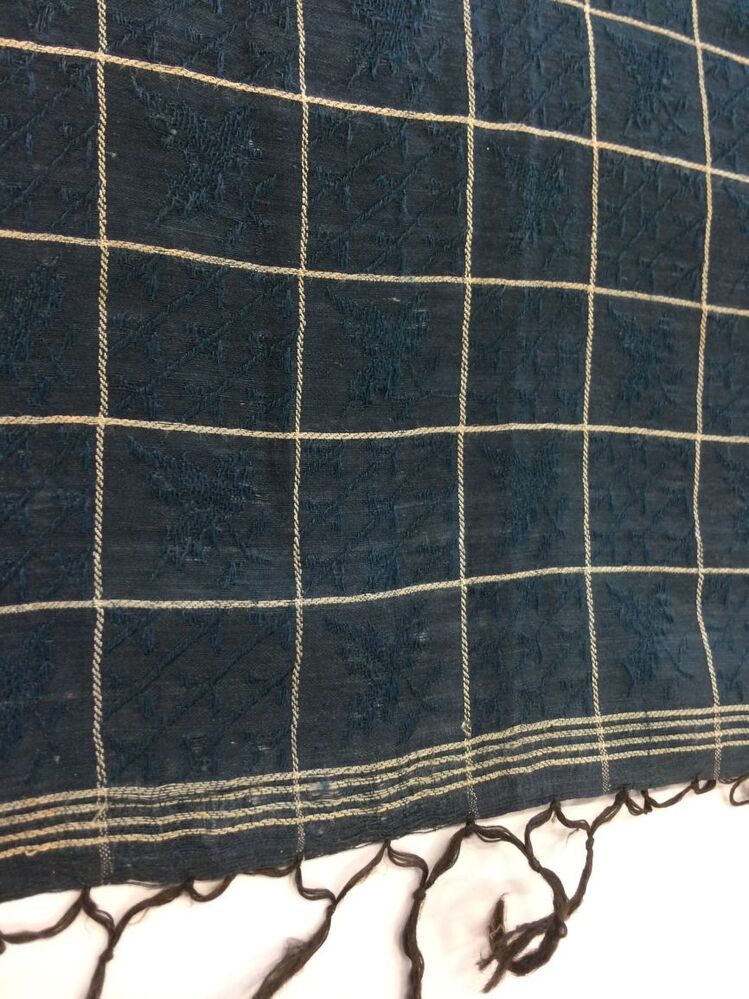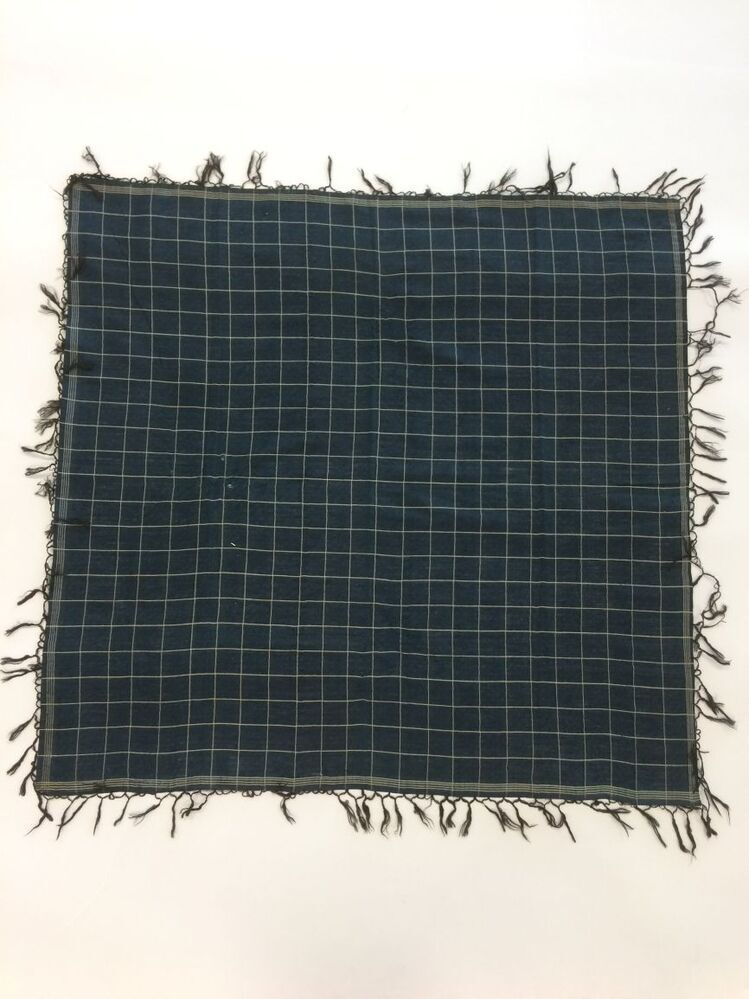 Blauwe vierkante sjaal van zijde met katoen, jaquardweefsel met geknoopte zijden franje