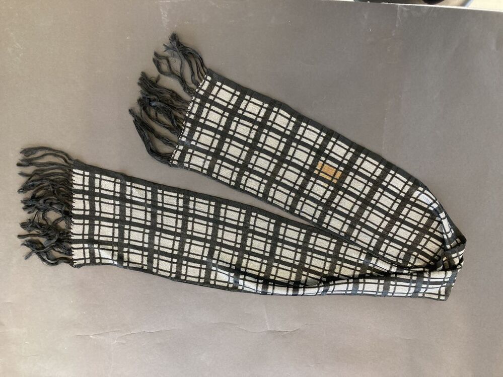Zwart-grijs geruite sjaal, met geknoopte franje