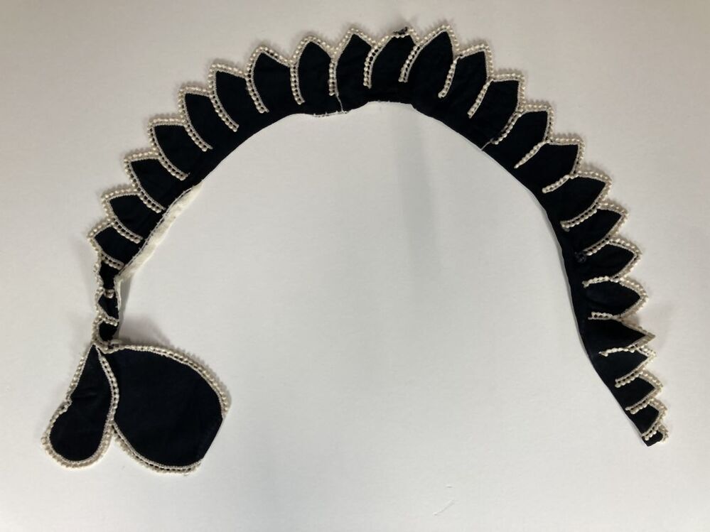 Wijde kraag met strik van zwarte crepe- zijde afgewerkt met creme borduurwerk
