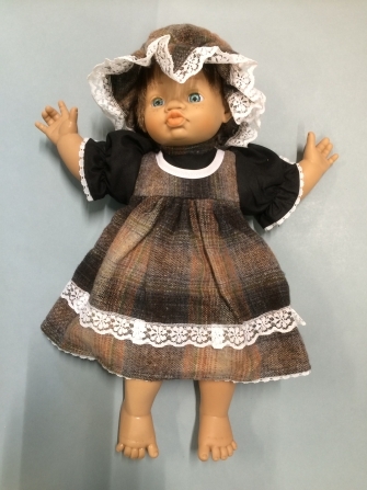 Karakterpop van vinyl, voorstellend meisje met bruin geruite jurk met bijpassende hoed