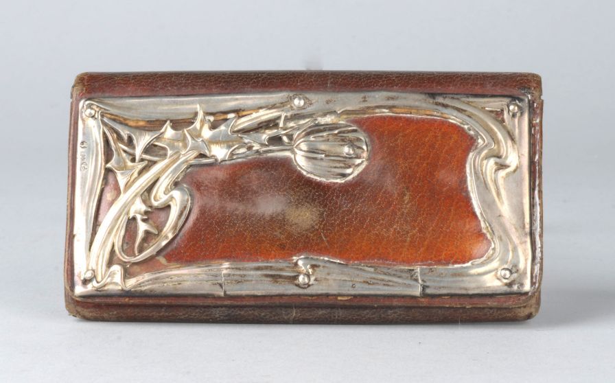 Bruin leren beursje met decoratie van zilver, distel in Jugendstil