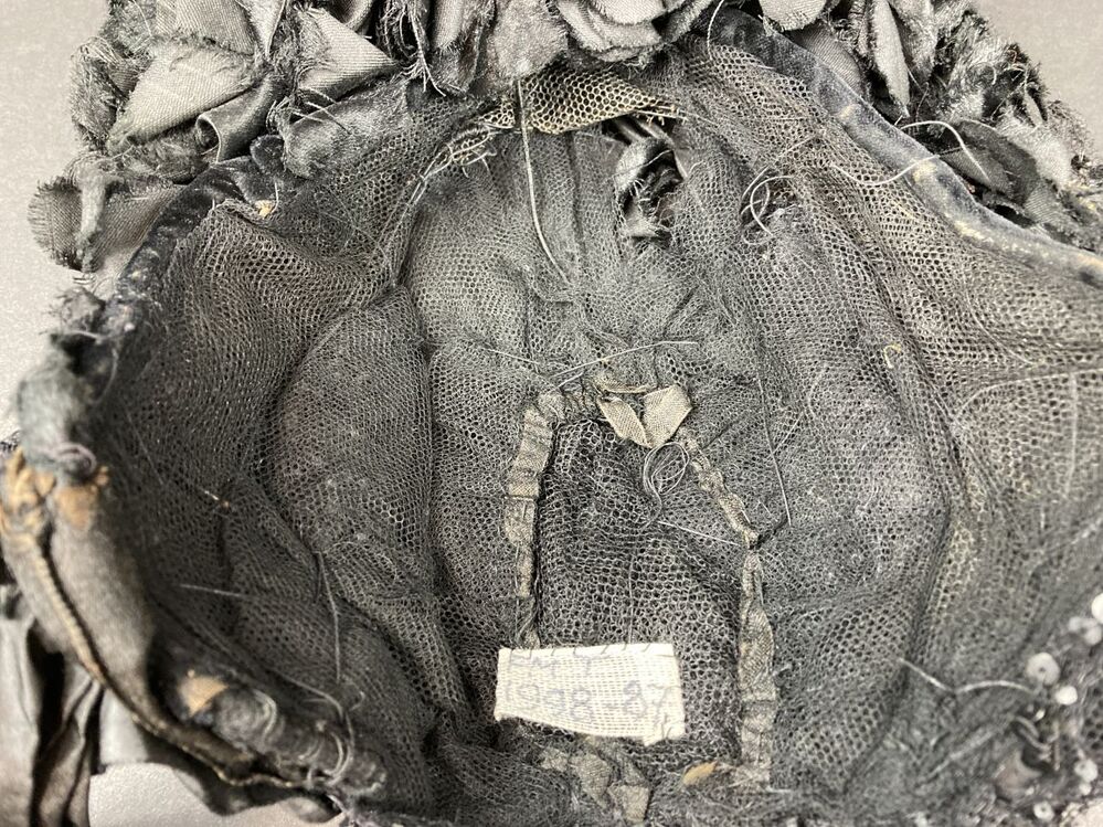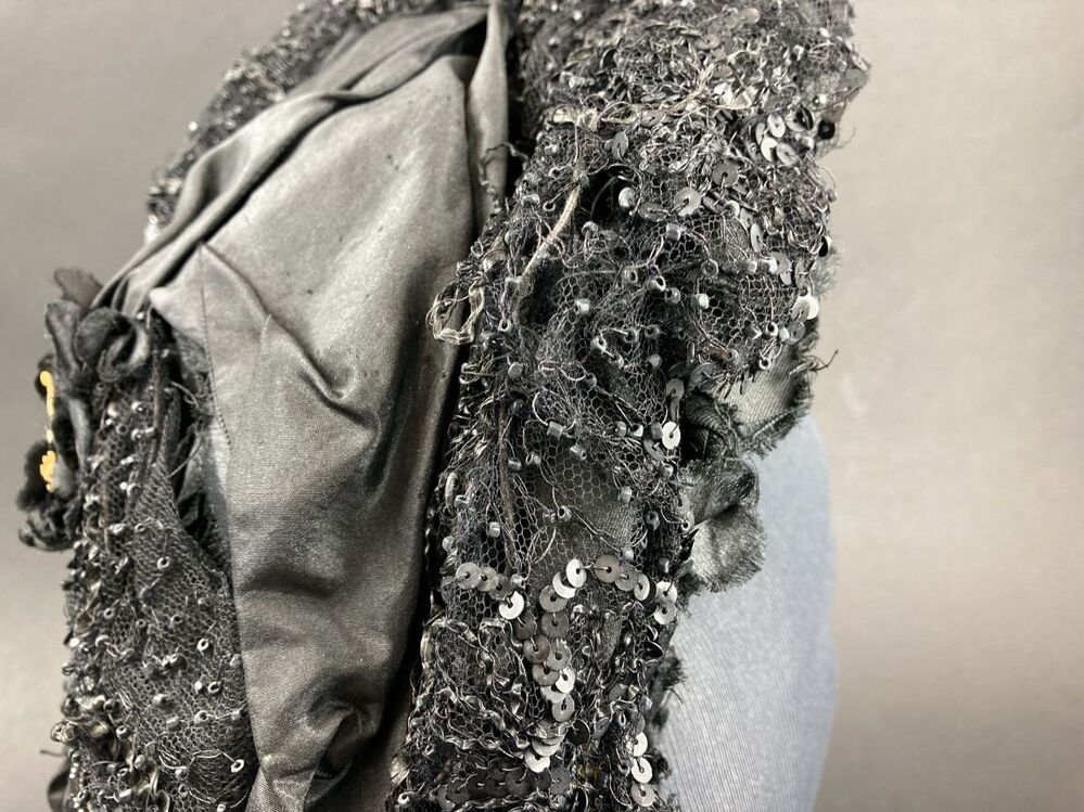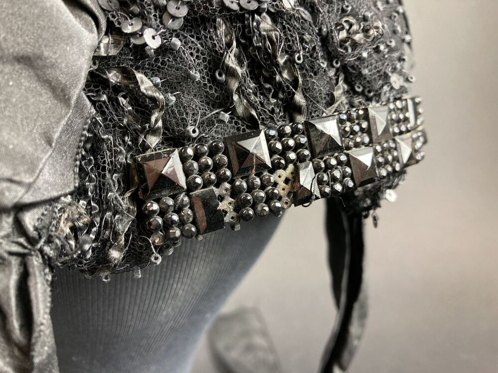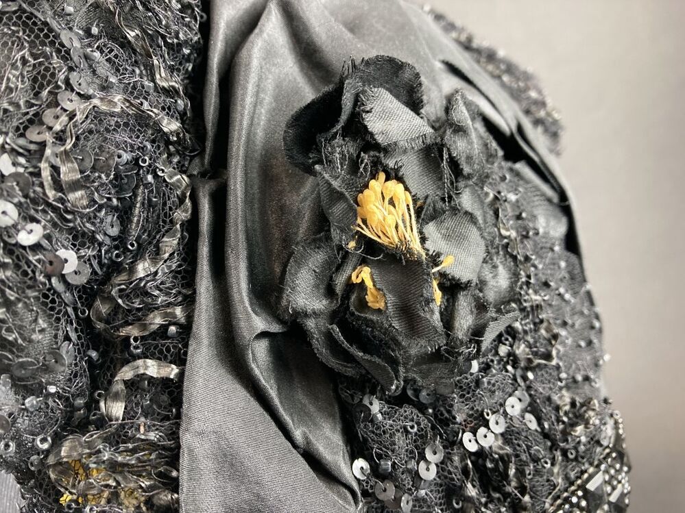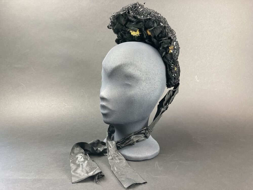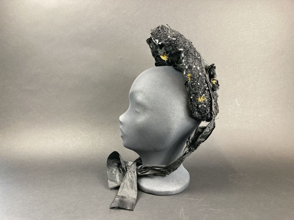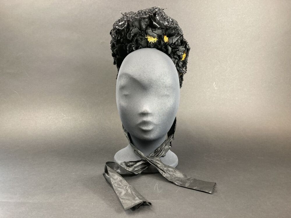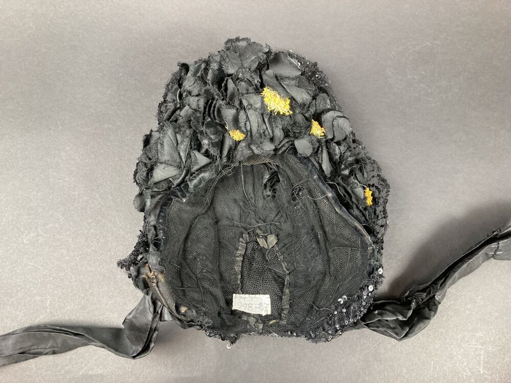 Zwart hoedje of kypske van satijn en tule met bloemen met gele hartjes