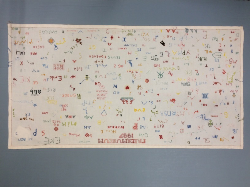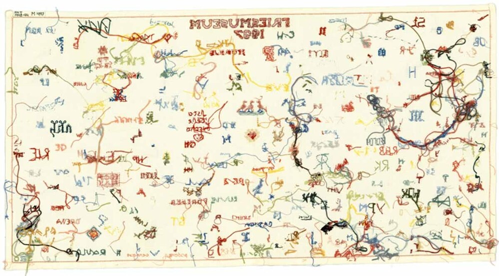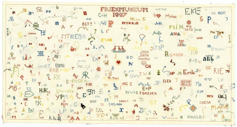 Textielwerken, meestal van fijne stof, waarop door vrouwen en meisjes in verschillende steken is geborduurd en die bedoeld zijn om in te lijsten. Ze werden doorgaans gemaakt door beginnelingen om hun vaardigheden te tonen. Kenmerkend zijn een combinatie van steken, motieven, letters en verzen, en vaak de voltooiingsdatum en de naam van de borduurster. (AAT-Ned)