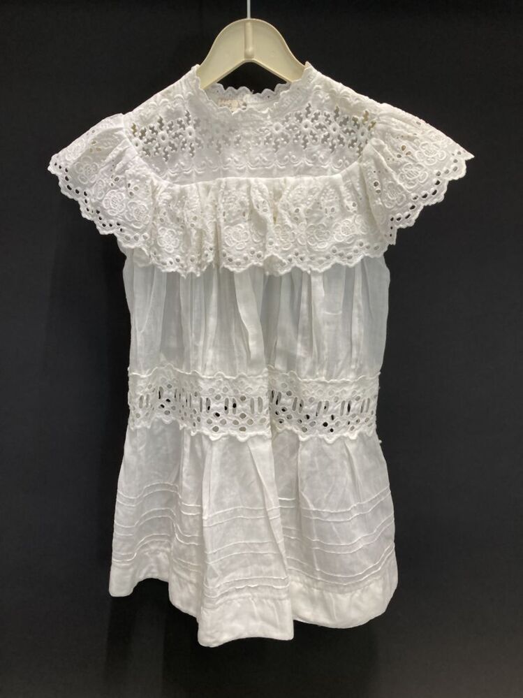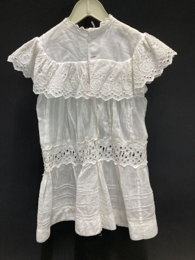 Batisten kinderjurkje met op heuphoogte een kanten tussenzetsel en met een brede kanten kraag