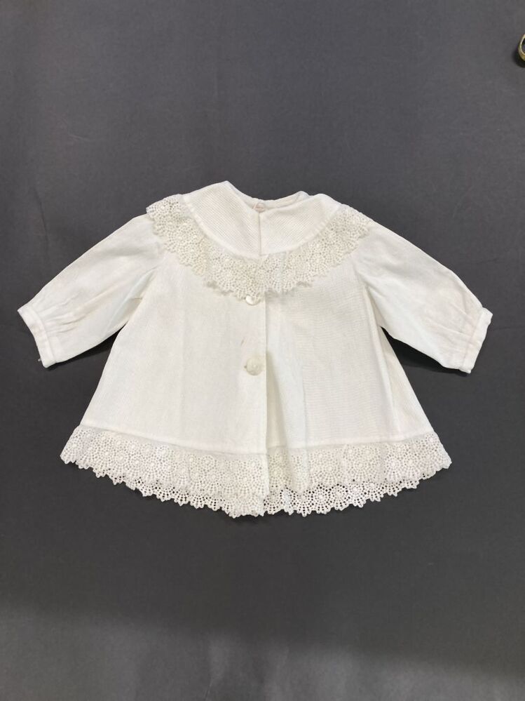 Kindermanteltje van crème-kleurige ribs-piqué, rmet brede platte kraag, afgezet met een strook broderiekant