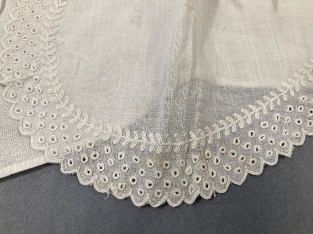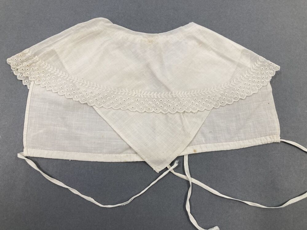 Inzetkraag chemisette waarvan de rand is versierd met schulpjes, nestelgaatjes en tamboereerwerk