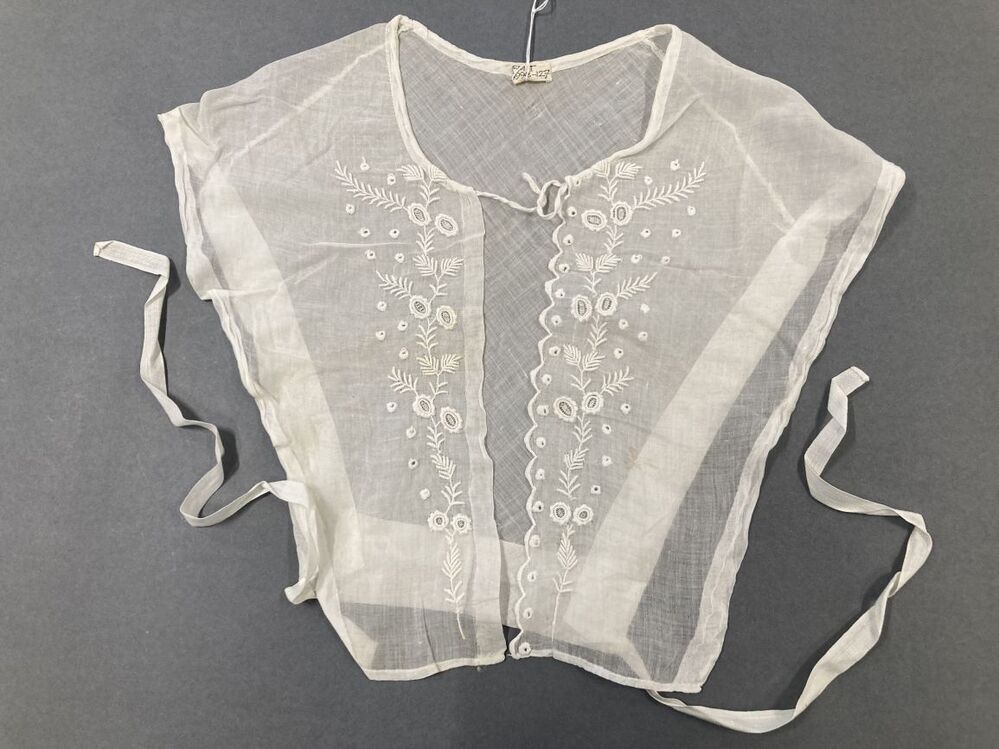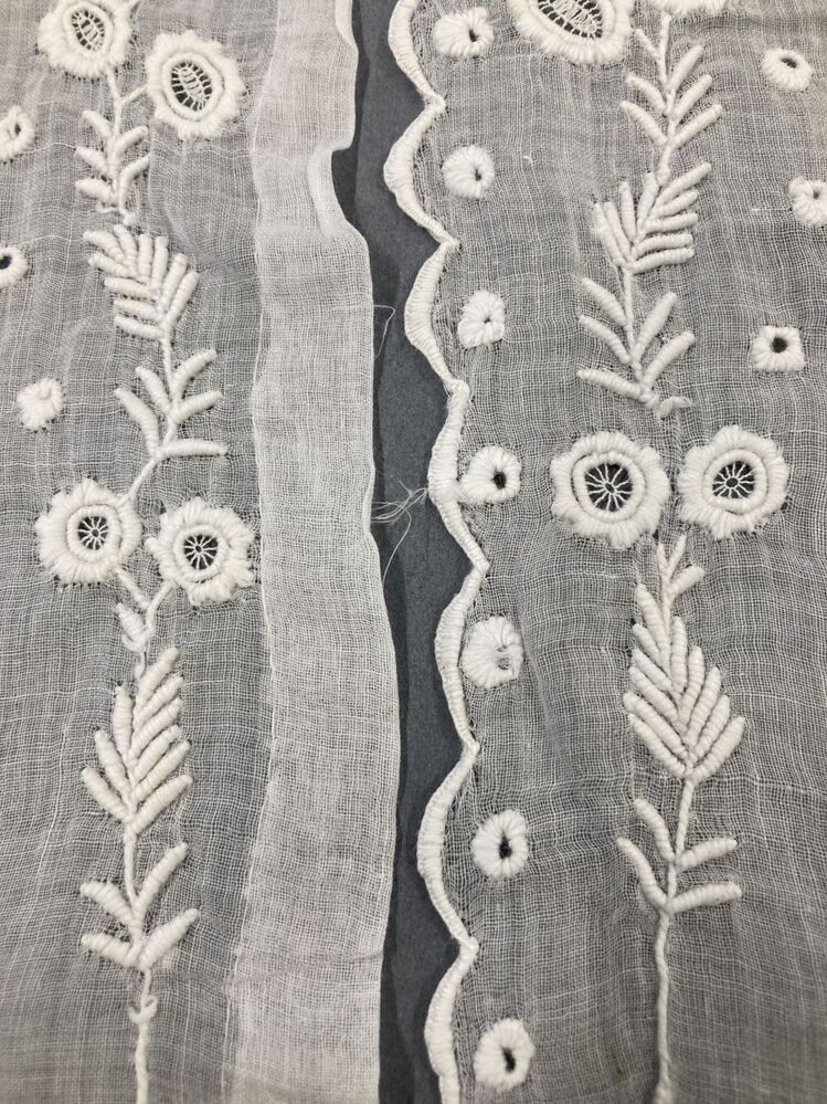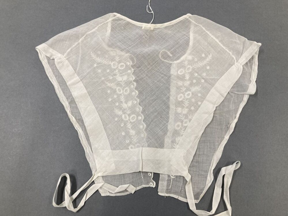 Wit driehoekig batisten inzetvestje met wit borduurwerk langs beide kanten