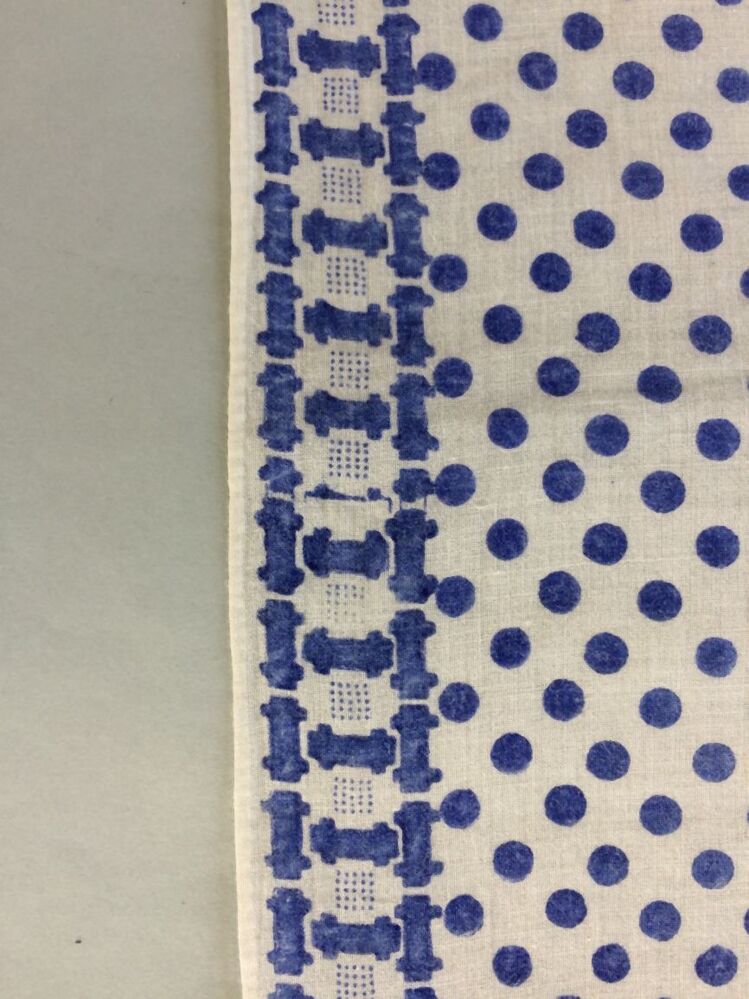 Vierkante sjaal van wit katoen bedrukt met blauwe stippen en rand