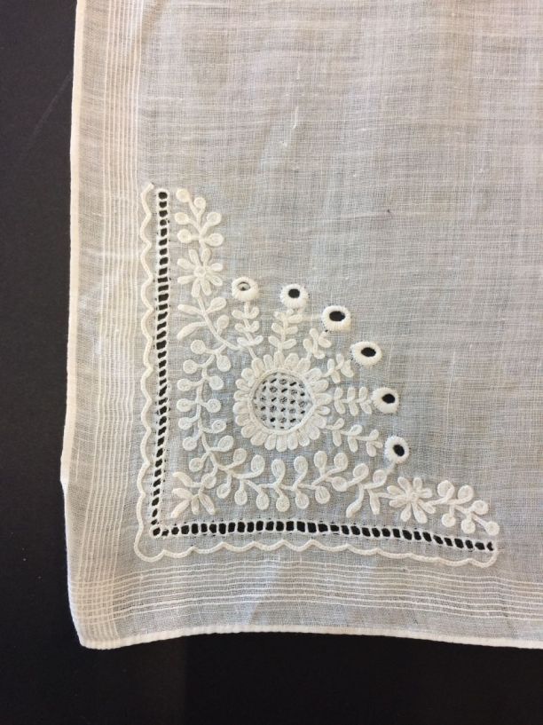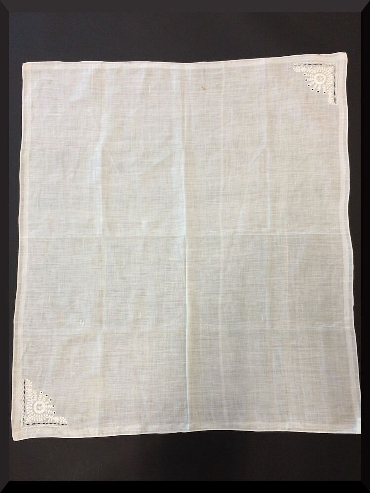 Vierkante halsdoek met twee geborduurde hoekmotieven, diagonaal geplaatst