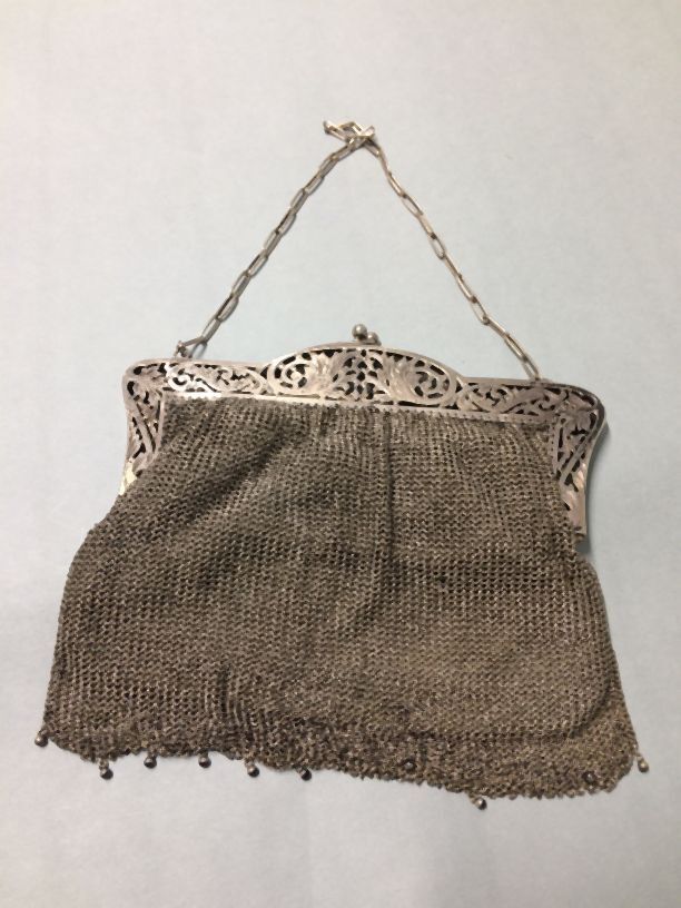 Hoekige zilveren beugel met gezaagd floraal motief en maliëntas aan ketting