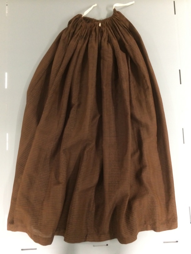 Rok van gestreepte wol, bruin met zwart, gedragen bij roodbruin jak FM1999-013