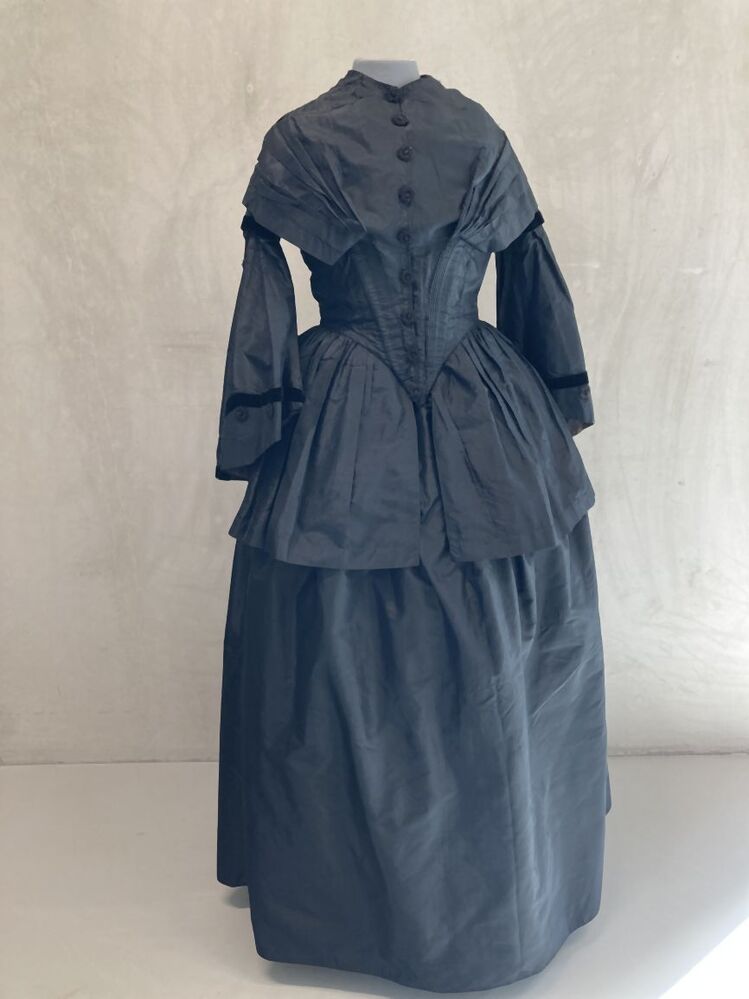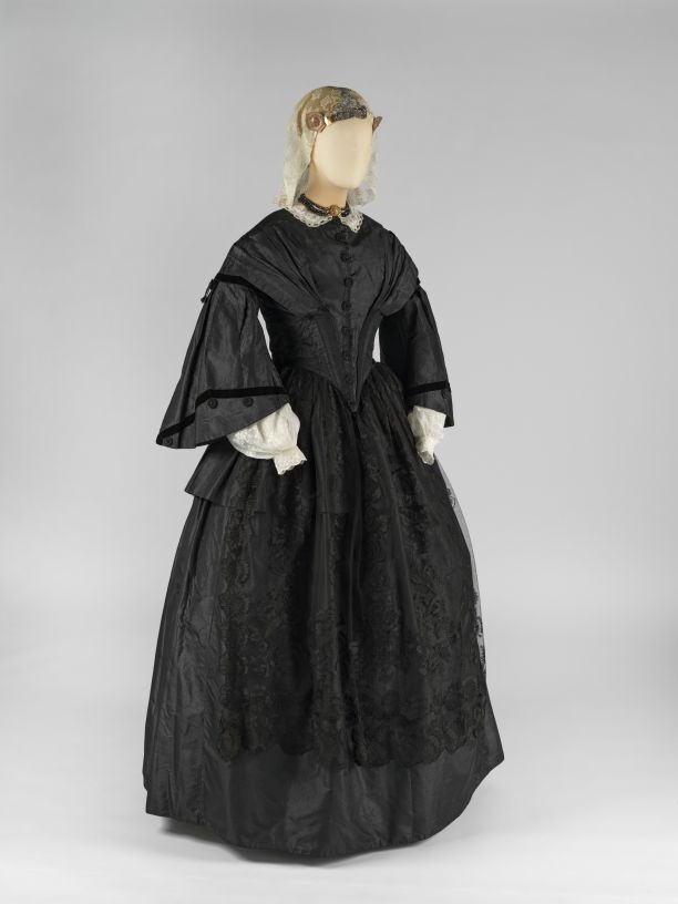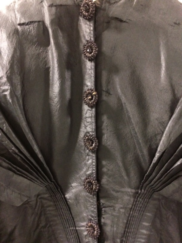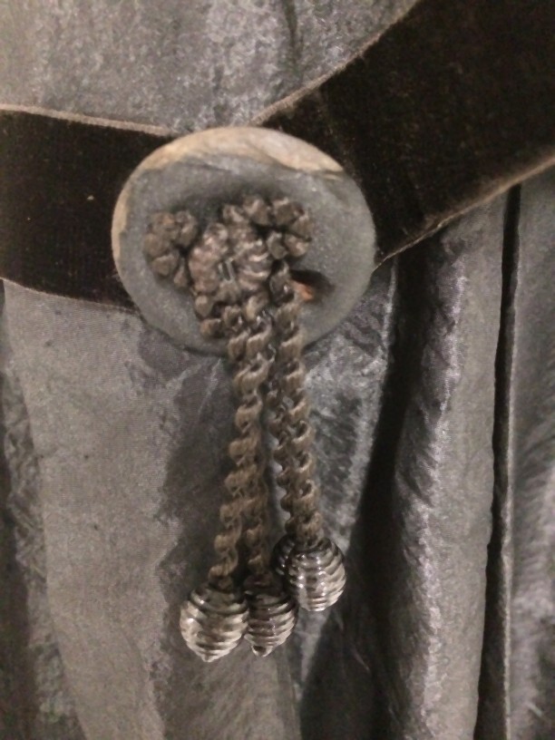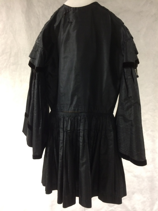 Schootjak met pagodemouwen van een trouwkostuum van zwarte zijde, afgezet met fluweelband en sierknopen met kraaltjes