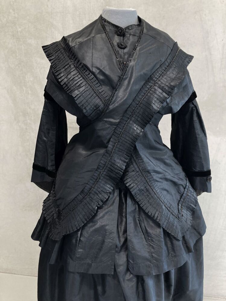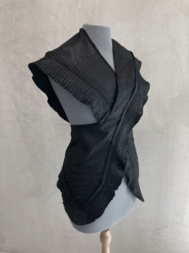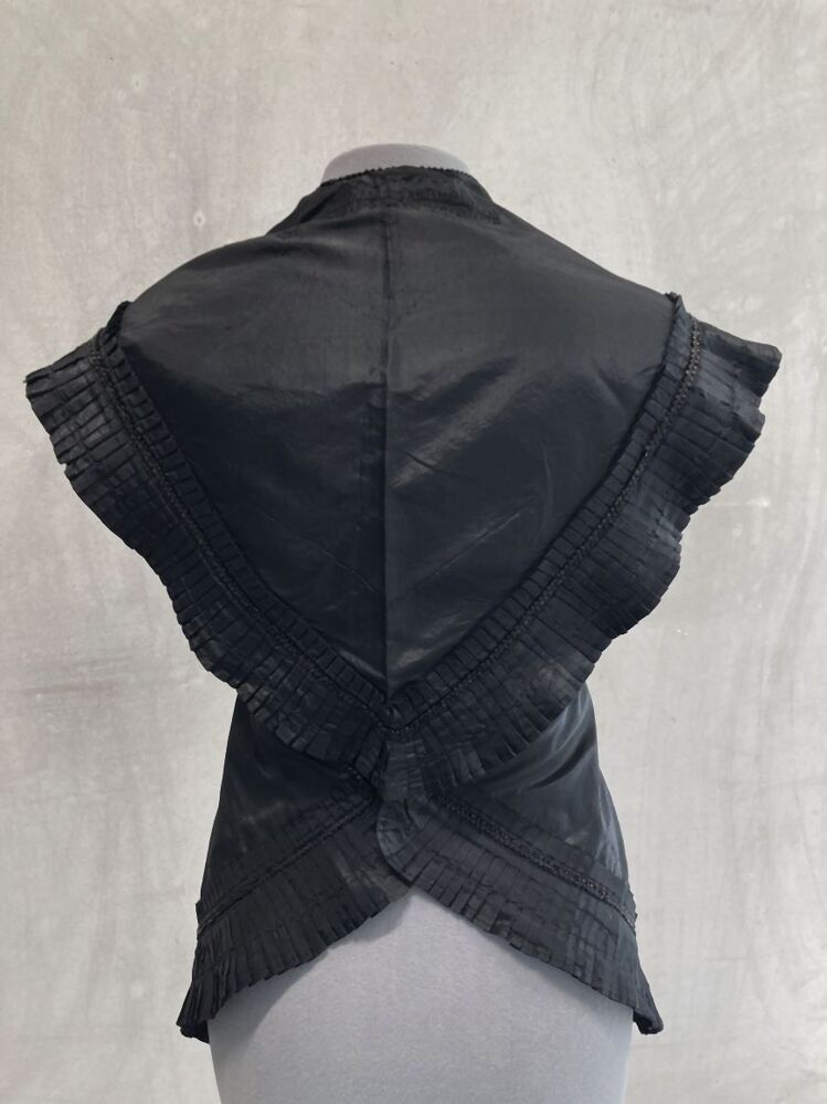 Schouderkraag van een trouwkostuum van zwarte zijde met geplooide randen