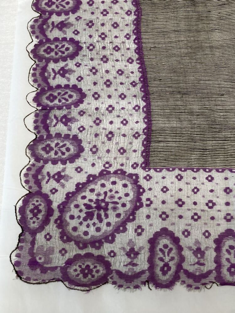Omslagdoek, wit met zwart gestreept middenveld, zwarte rand met ingeweven rozetten en strooibloemen, onderdeel groep accessoires bij trouwkostuum