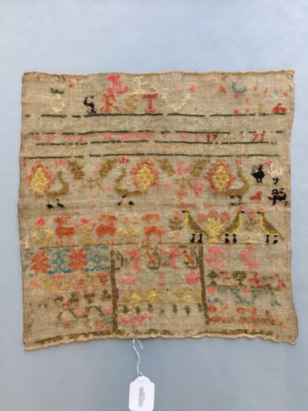 Merkletterlap geborduurd met wol op losgeweven ongebleekt linnen, 1773