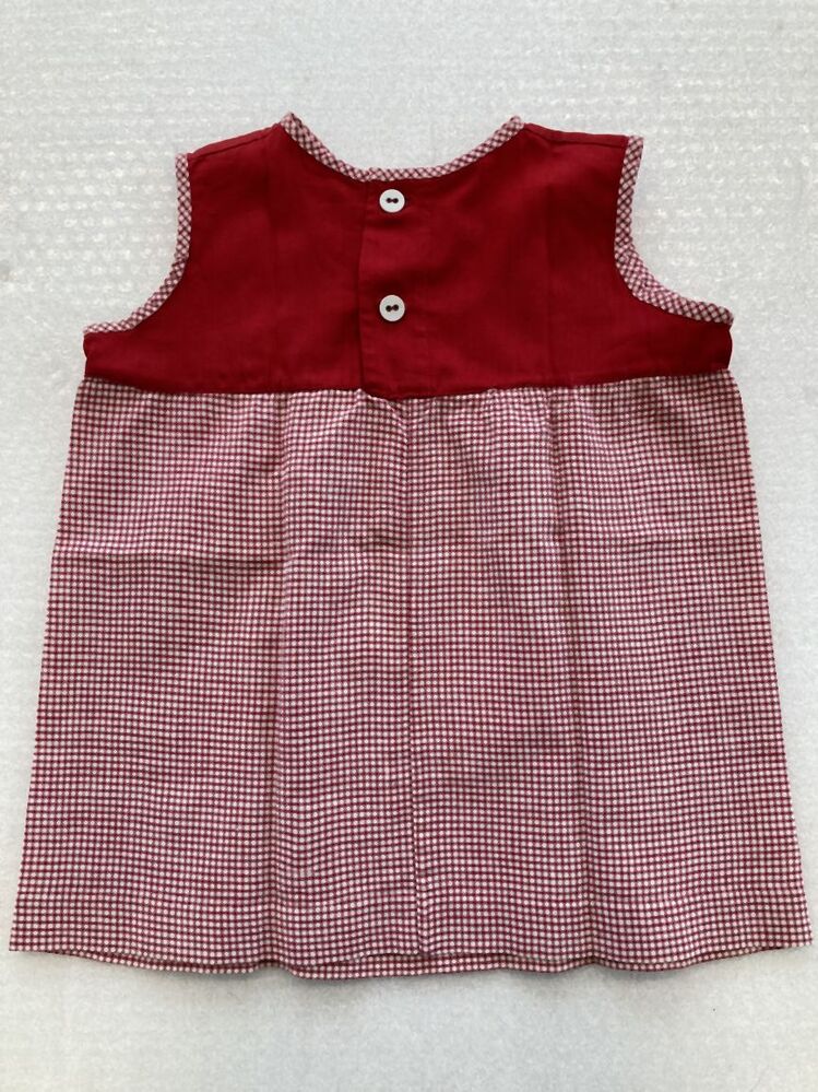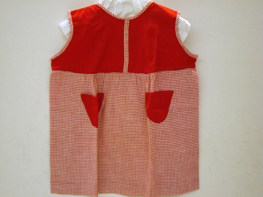 Hangjurkje met rode pas en rood-wit geruite rok, handgenaaid als schoolhandwerk