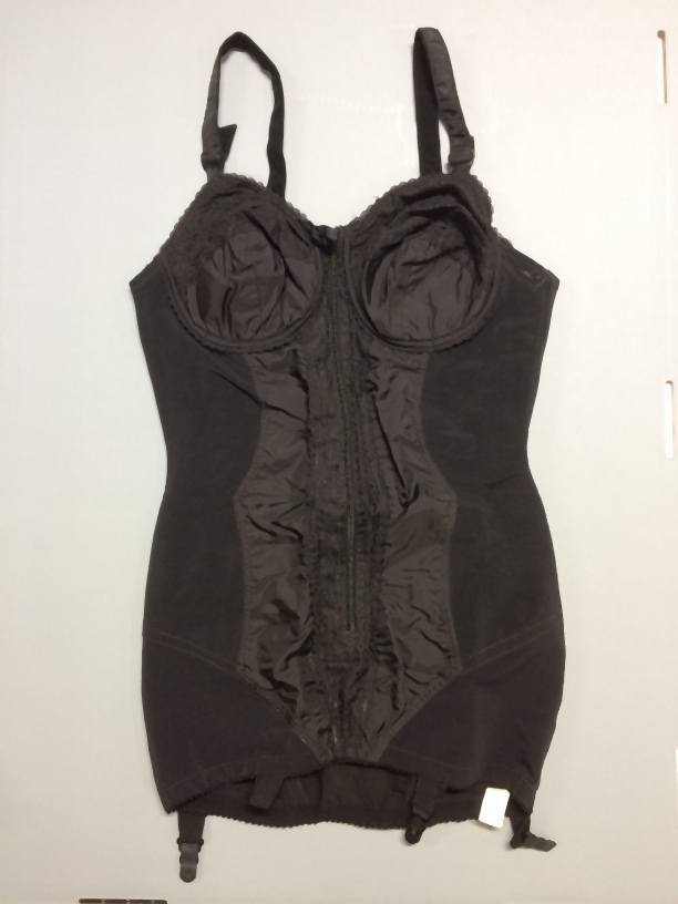 Zwart korselet, beha met lijfje eraan vast, zonder kruisje van elastisch materiaal, maat 95B, onderdeel van beige koffer met lingerie