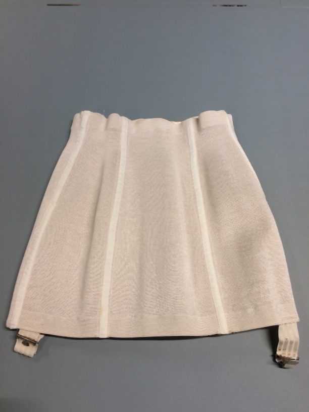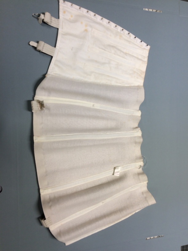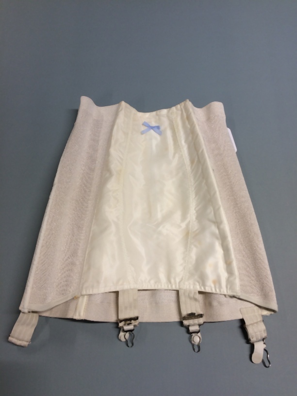 Witte gaine, brede corrigerende band, zonder kruisje, maat 72B, onderdeel van beige koffer met lingerie