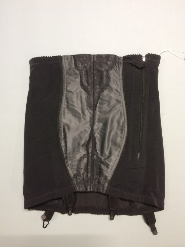 Zwarte gaine, corrigerende band, zonder kruisje met sluiting, maat 72B, onderdeel van beige koffer met lingerie