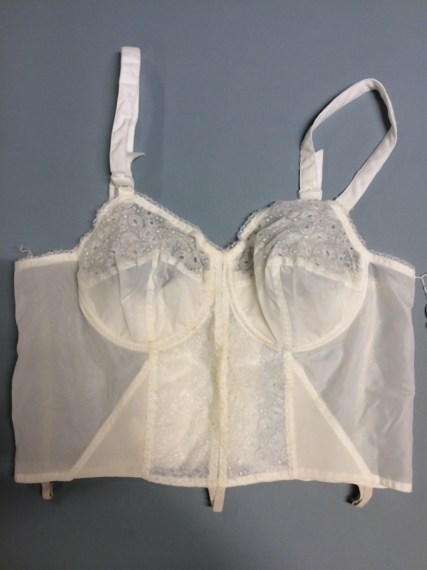 Witte bustehouder met maagband, maat 95B, onderdeel van beige koffer met lingerie