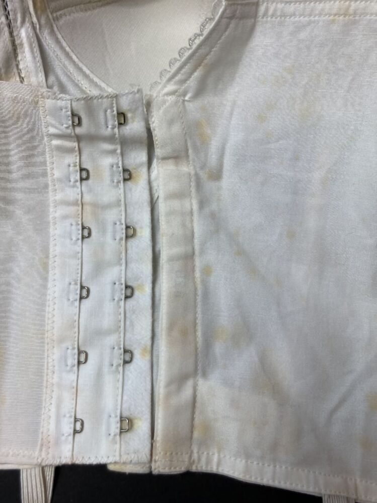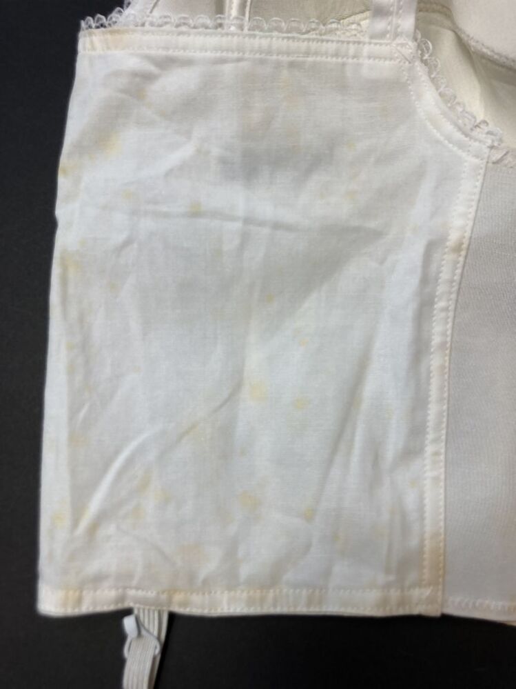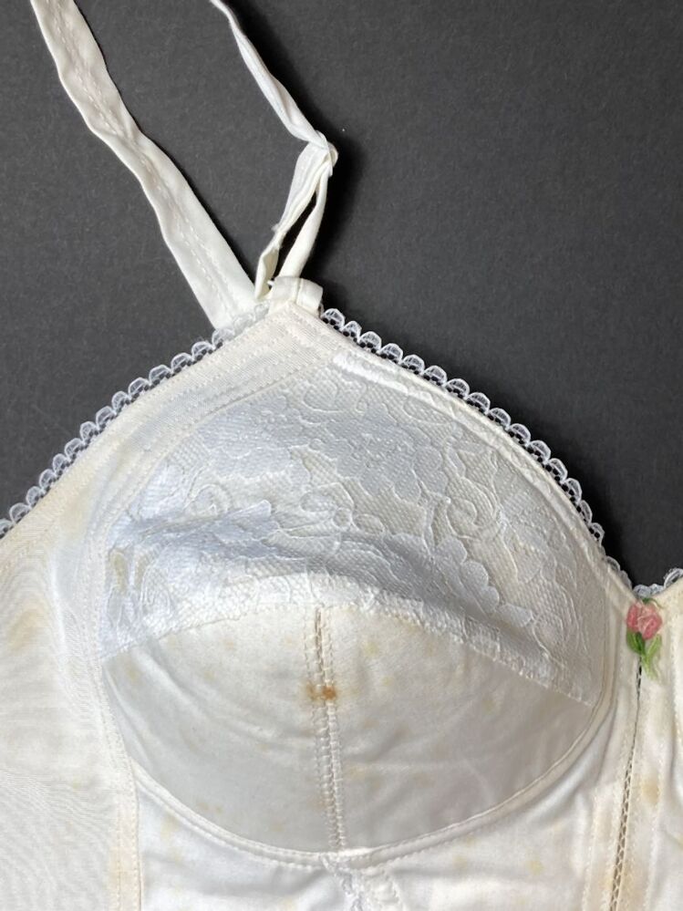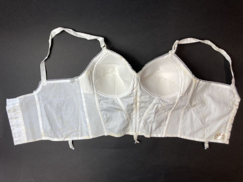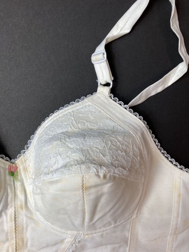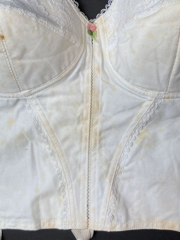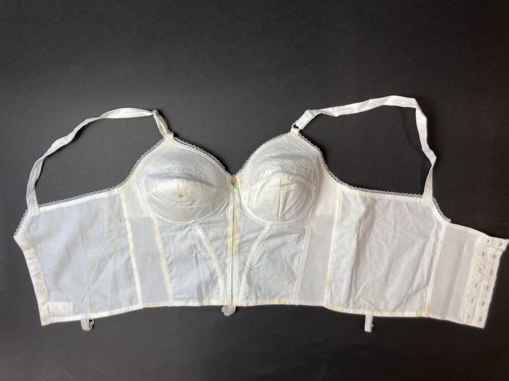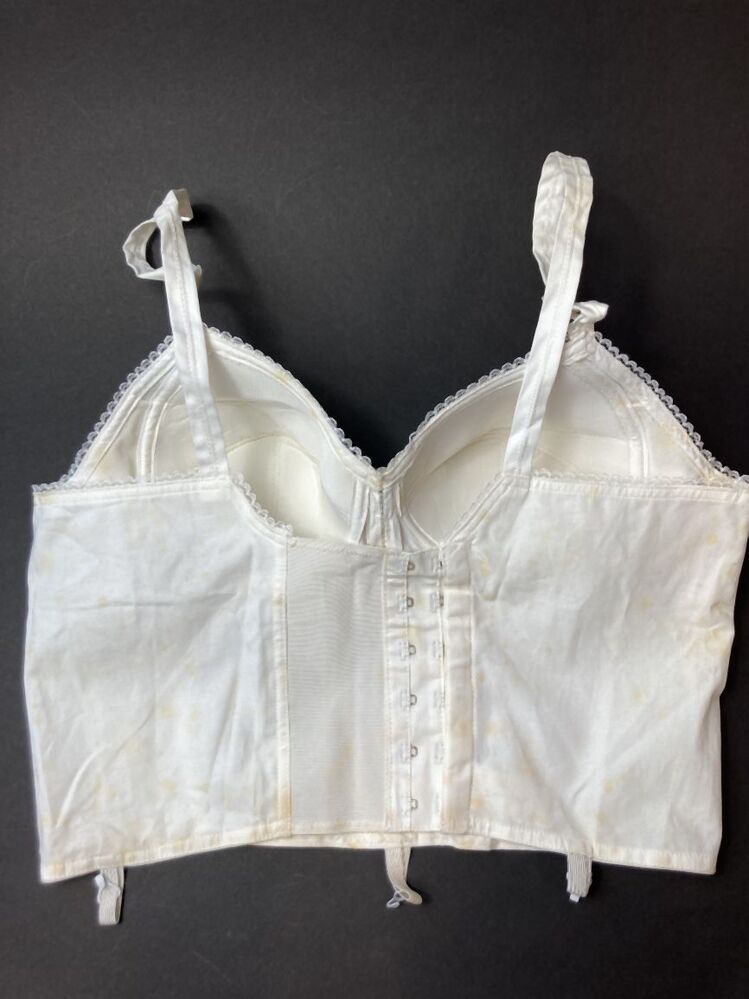 Witte bustehouder met maagband, maat 85B, onderdeel van beige koffer met lingerie