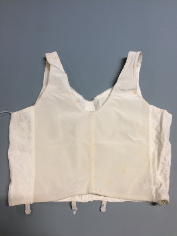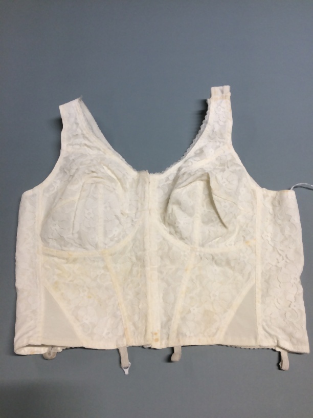 Witte bustehouder met maagband, maat 95B, onderdeel van beige koffer met lingerie