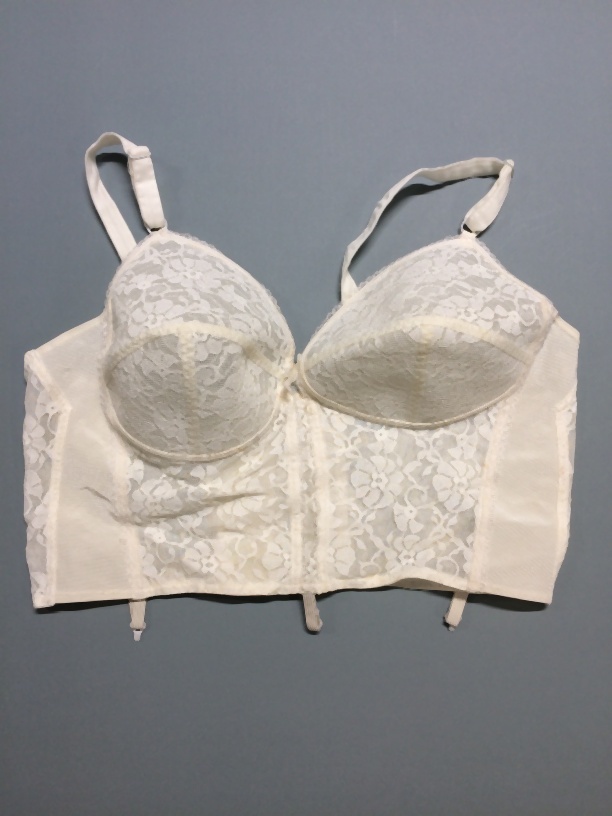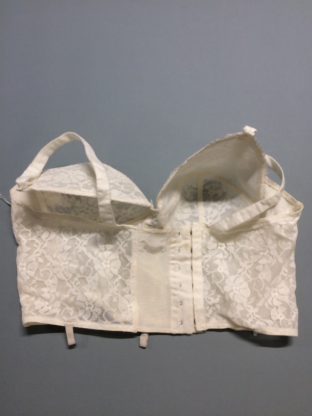 Witte bustehouder met maagband, maat 95, onderdeel van beige koffer met lingerie