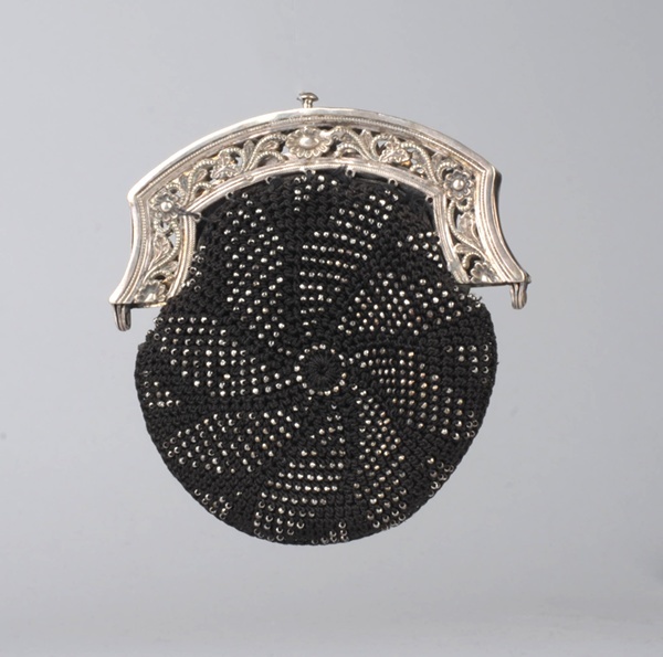 Beursje met zilveren beugel en kralenbreiwerk van zwart garen en zilverkleurige metalen kraaltjes