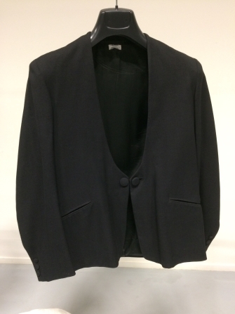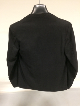 Zwarte wollen jas zonder kraag met lage V-hals, onderdeel van nieuw-Fries herenkostuum