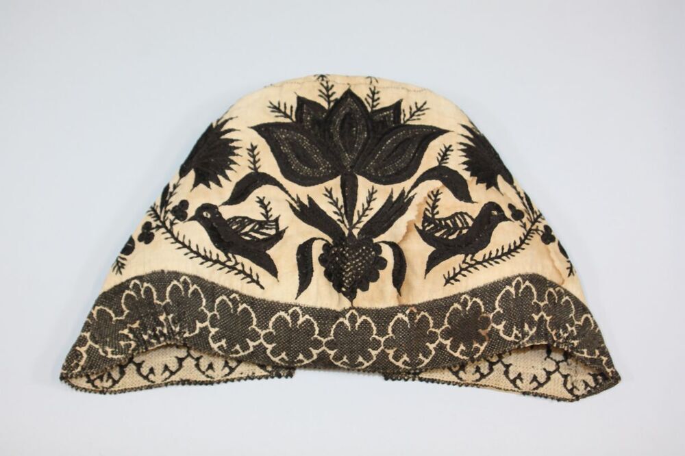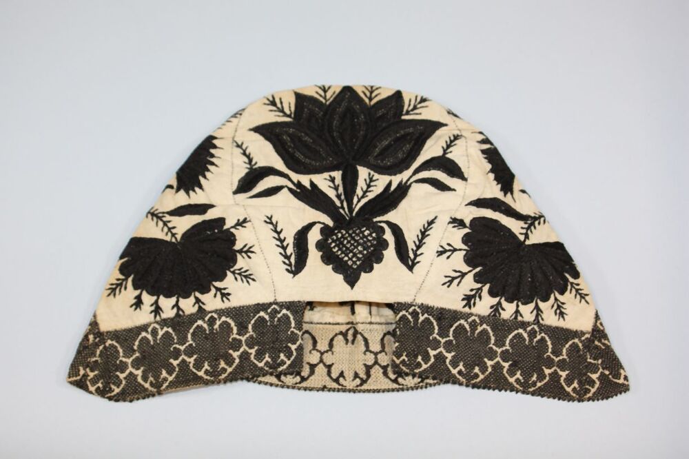Huismuts of tussenmuts van linnen met zwarte zijde geborduurd afgezet met langetband met vierpas