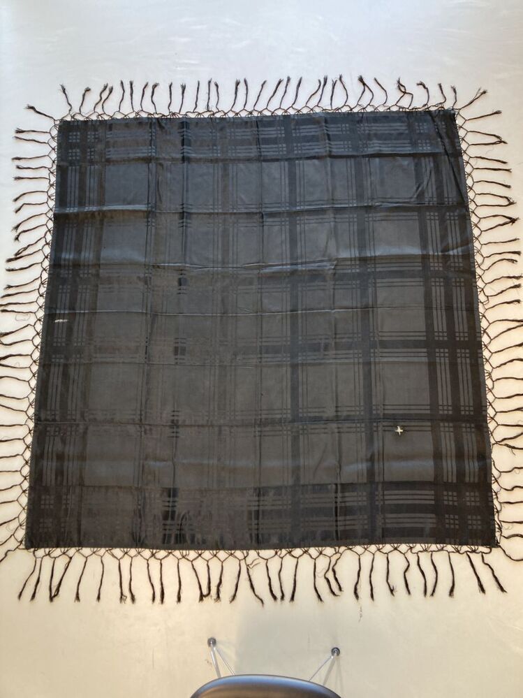 Omslagdoek van zwarte zijde met satijn ruiten met geknoopte franje,