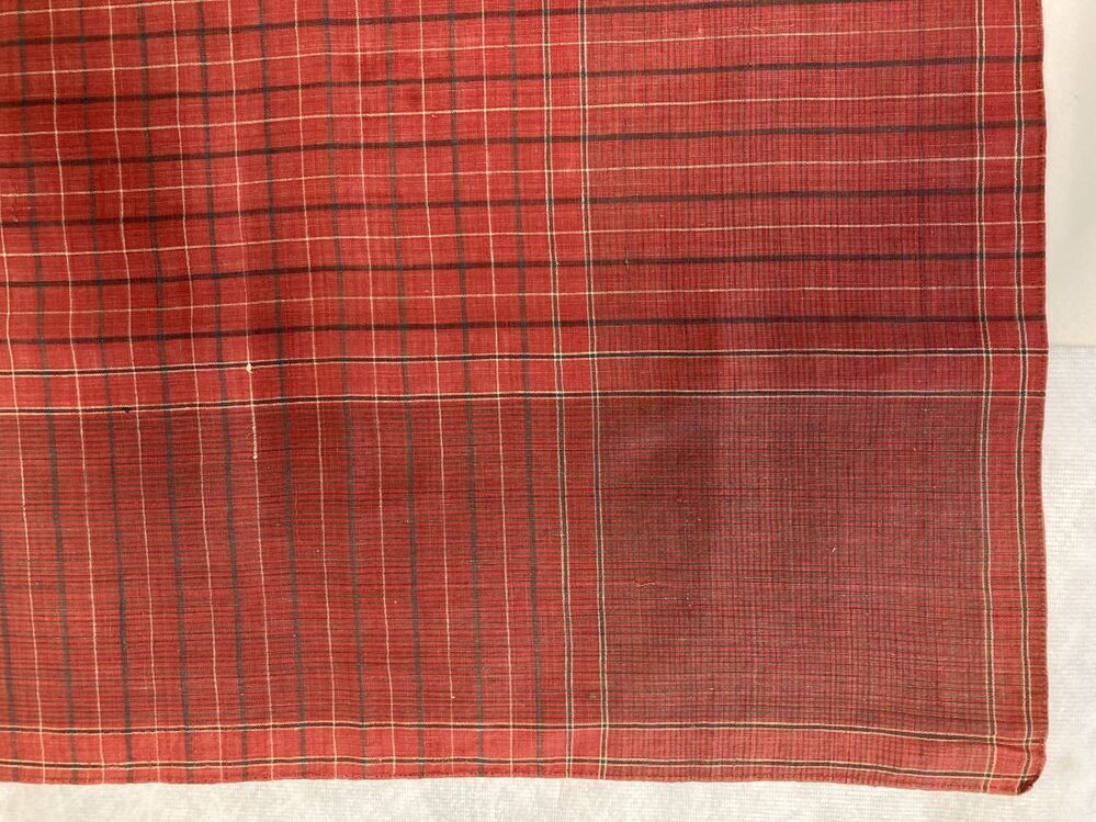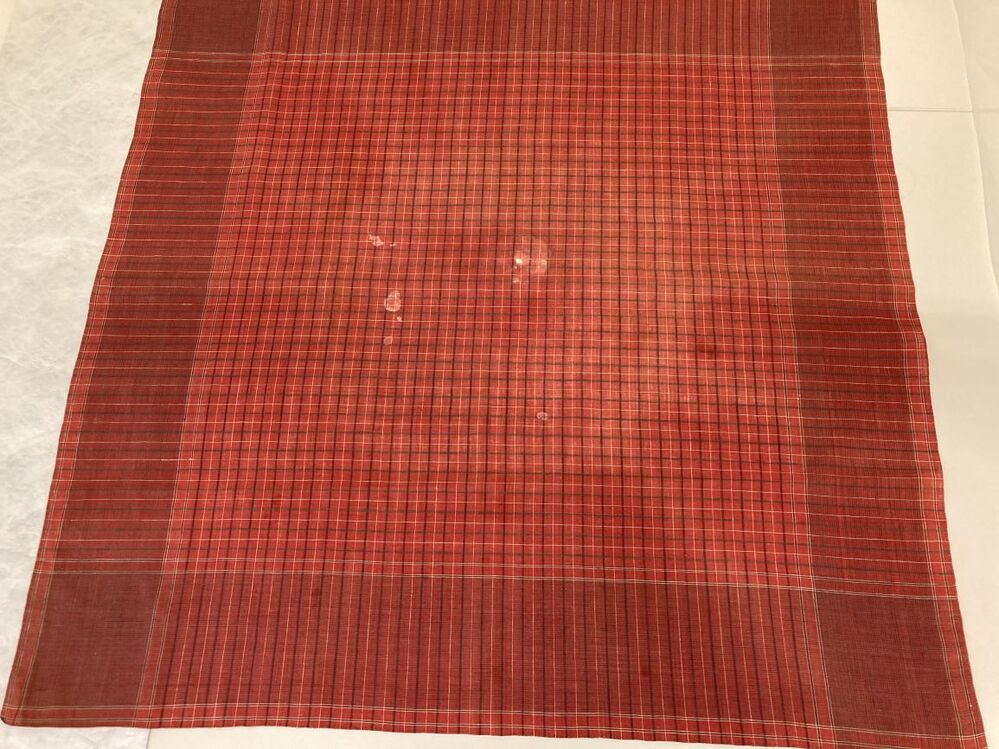Vierkante halsdoek van rood bont, gebruikt als tafelkleedje