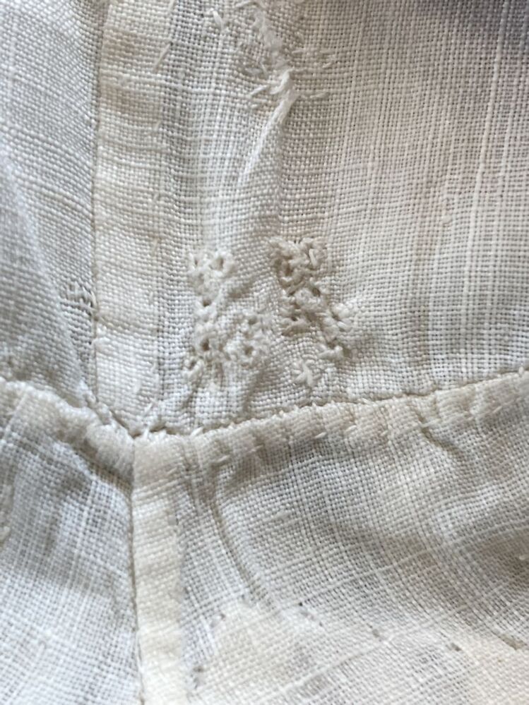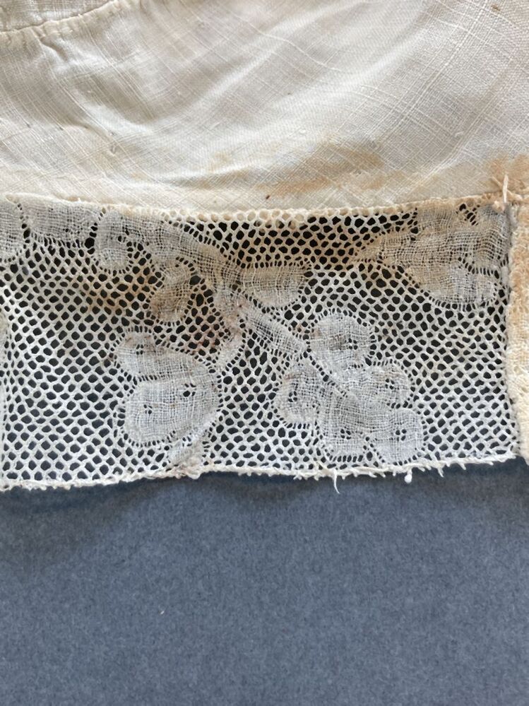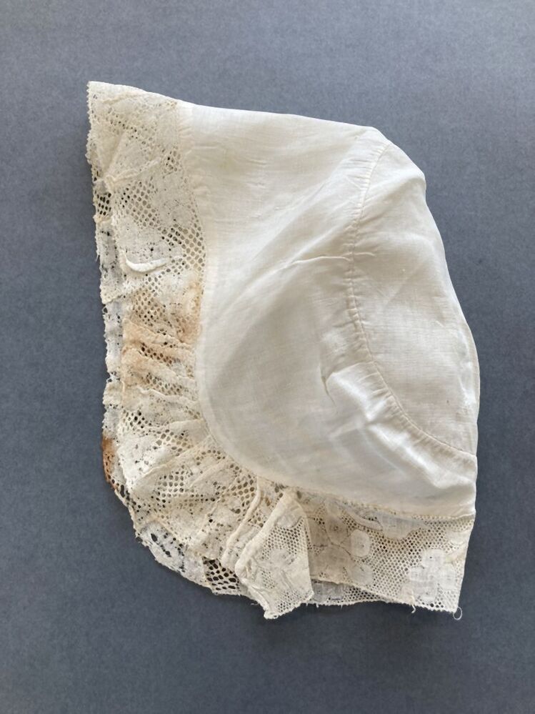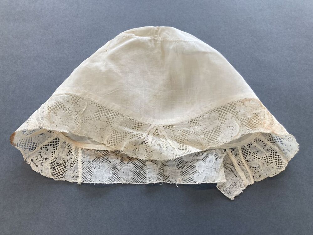 Tipmuts met linnen bol rondom afgezet met kloskant, afgeronde tip op voorhoofd