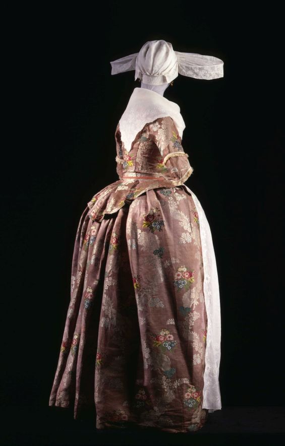 Trouwkostuum, gestreepte changeantzijde met gebrocheerd bloempatroon, afgezet met franje; gedragen door Isabella Stinstra uit Harlingen
