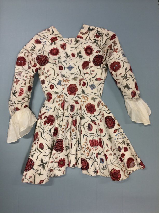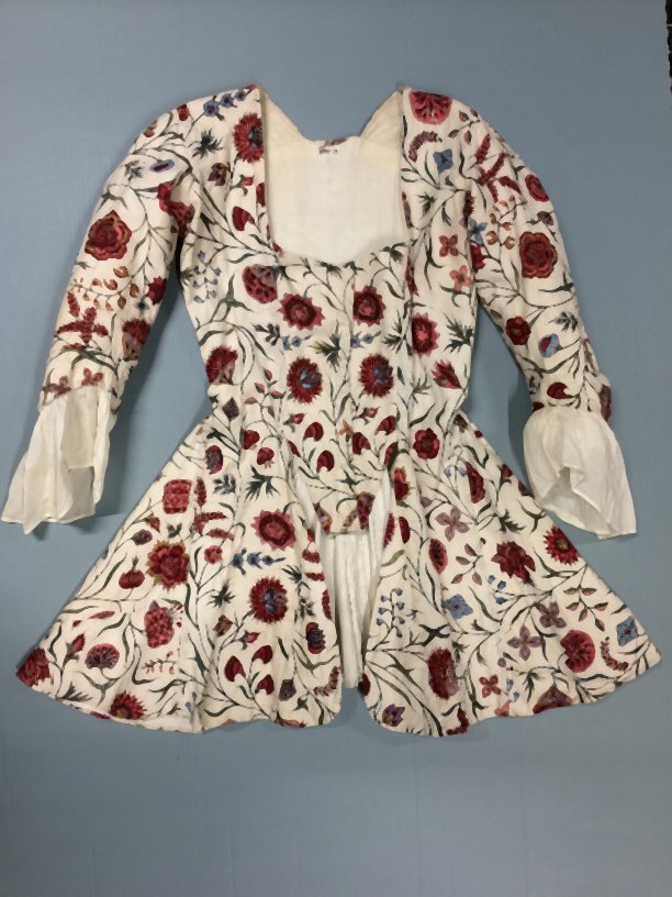 Sitsen vrouwenjak met lange klokkende schoot, witte grond met veelkleurige bloemranken
