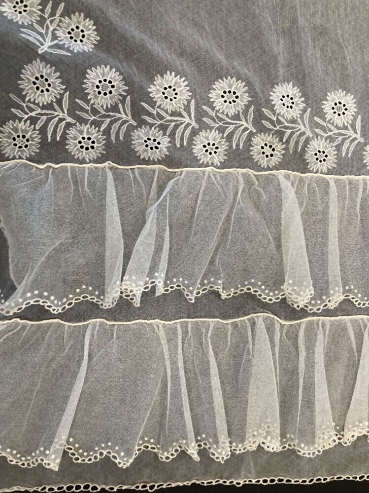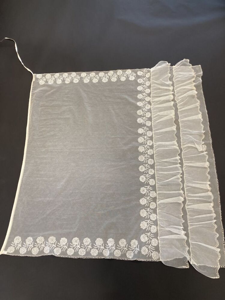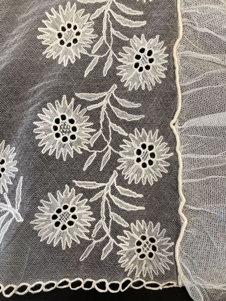 Sierschort van witte tule, met bloemen in doorstopwerk en met twee rimpelstroken langs zoom