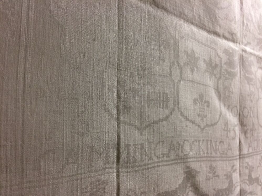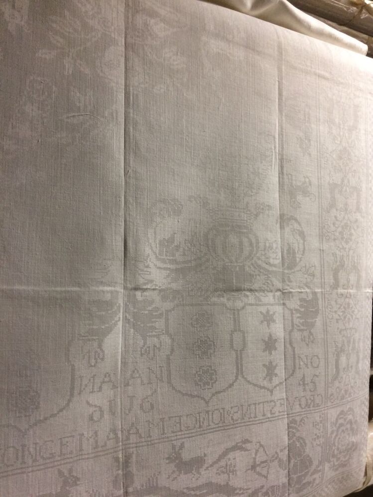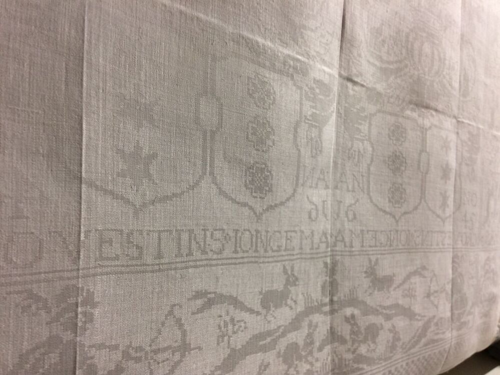 Damasten servet met inweving van Orfeus en de dieren en de wapens van Cammingha, Ockinga, Grovestins en Jongema, onderdeel van groep van twaalf servetten en één tafellaken