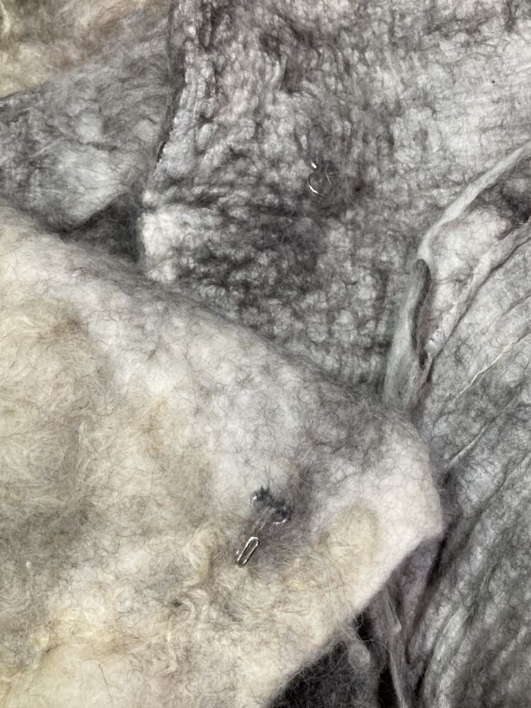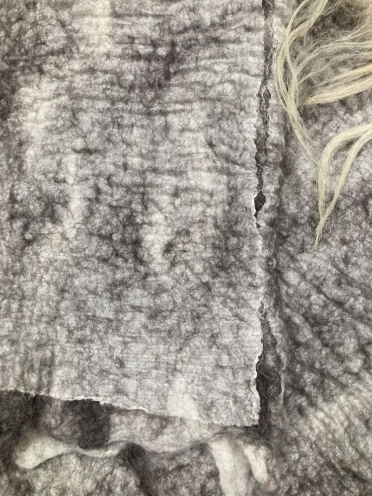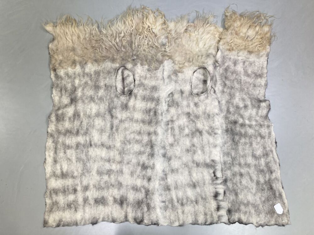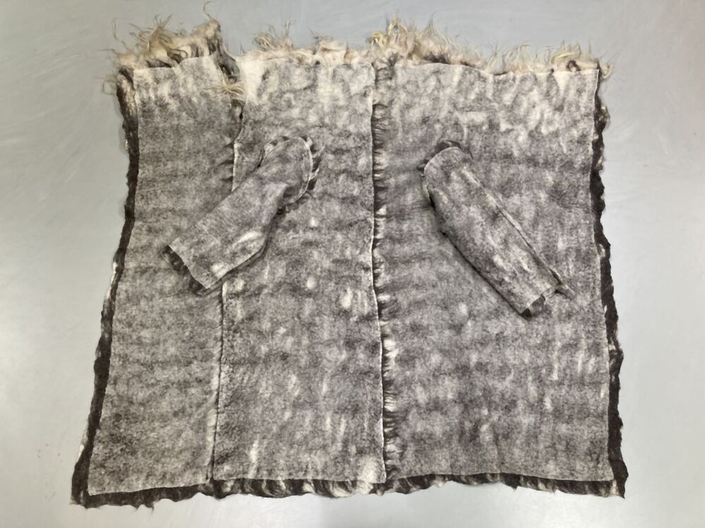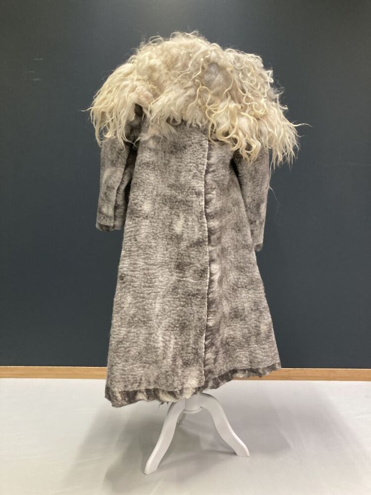 Rechte jas van vilt, met lange mouwen, met brede hals met ruige opstaande kraag