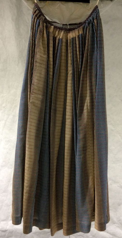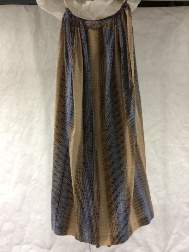 Rok van Fries kostuum, gedragen als trouwjurk, van wollen mousseline bedrukt met fantasie-streeppatroon in blauw, bruin, beige en rood