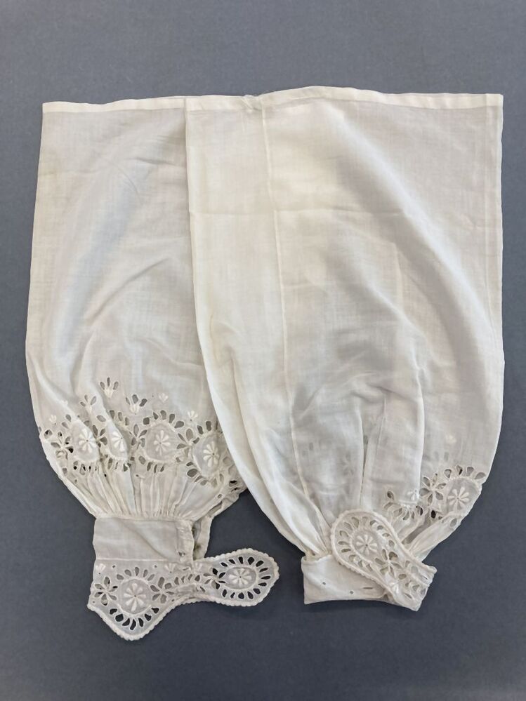 Paar wijde ondermouwen van wit batist met broderie, gerimpeld bij pols aan effen manchetje met geborduurde opslag