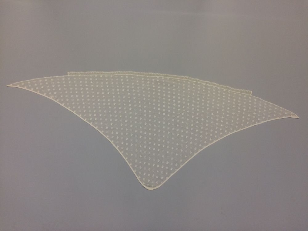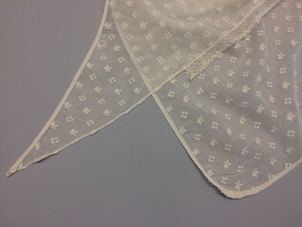 Tipdoek van batist met ingeweven gebrocheerde bloemetjes, de korte zijden afgewerkt met veterband en machinaal tulekantje langs de lange zijde
