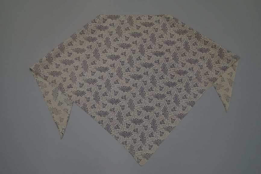 Tipdoek van bedrukt katoen, bestrooid met paarse boeketjes waartussen een gearceerd wiermotief
