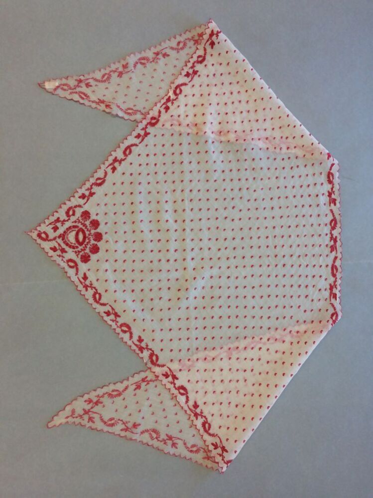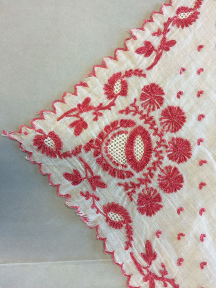 Tipdoek van katoenen batist met tamboereerwerk in rood en rondom een rank, met waaiervormig hoekmotief en strooimotiefjes