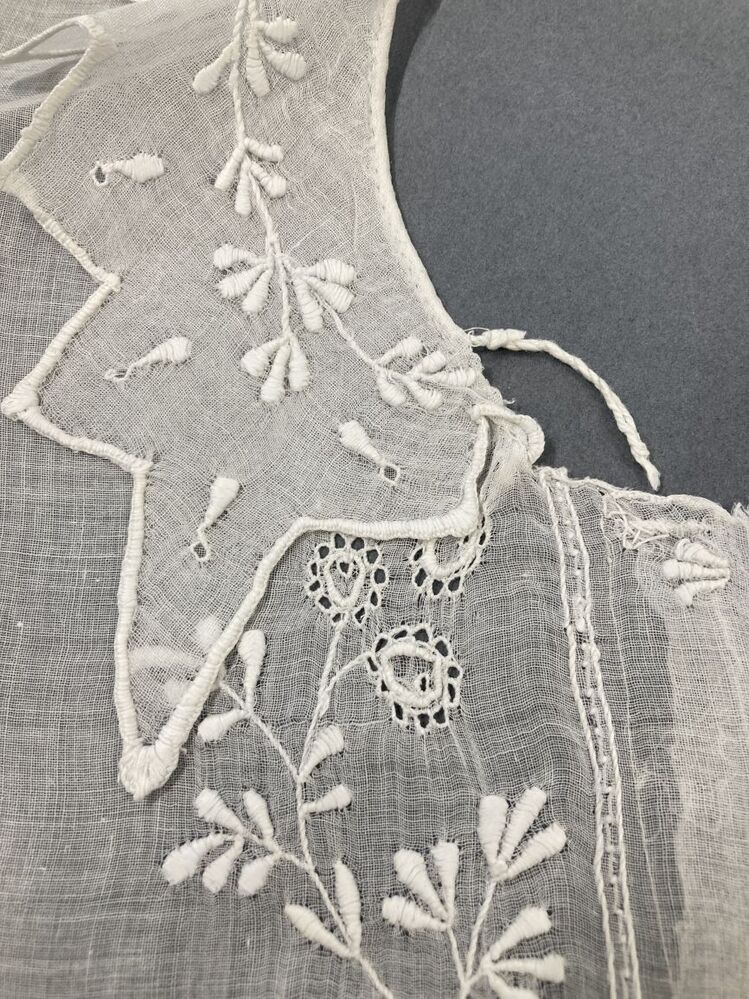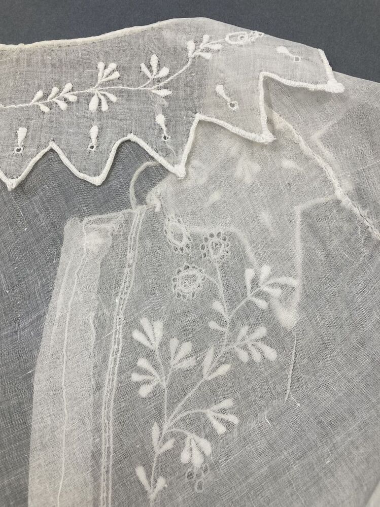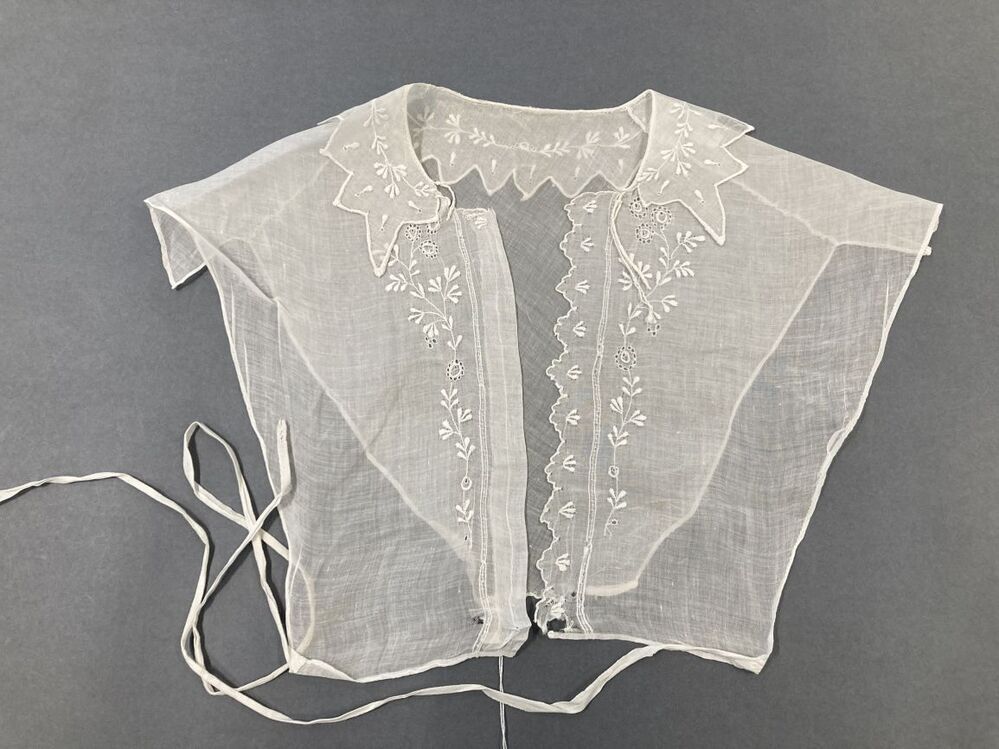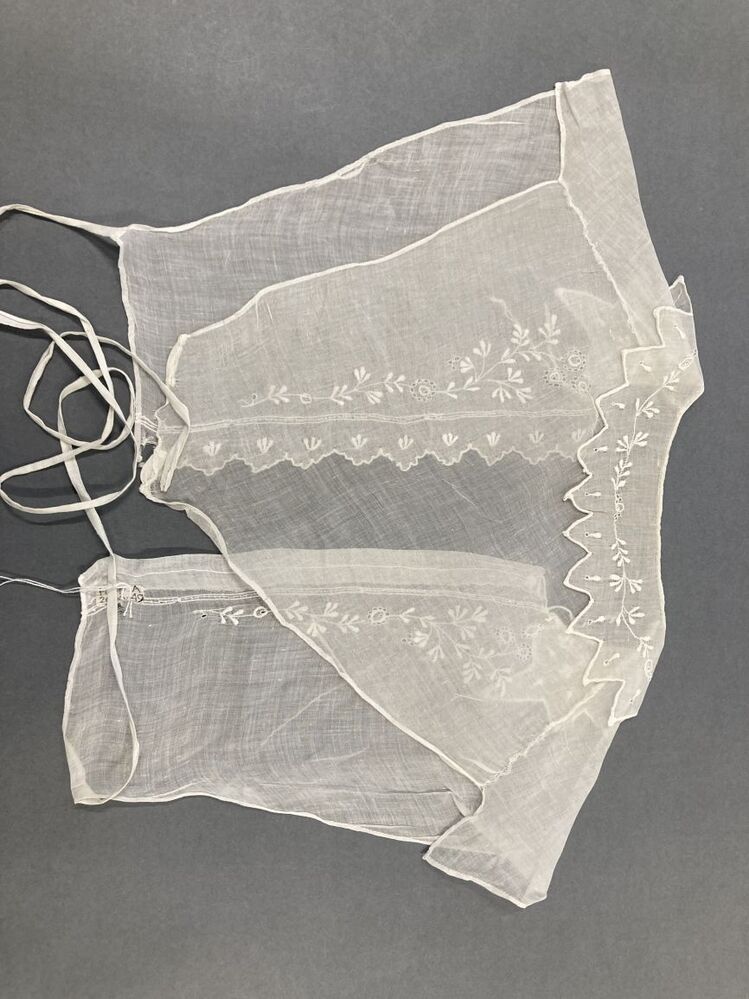 Chemisette van neteldoek, twee taps toelopende voorpandjes met rank langs opening