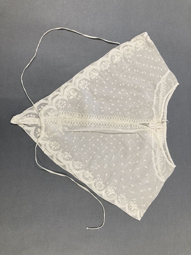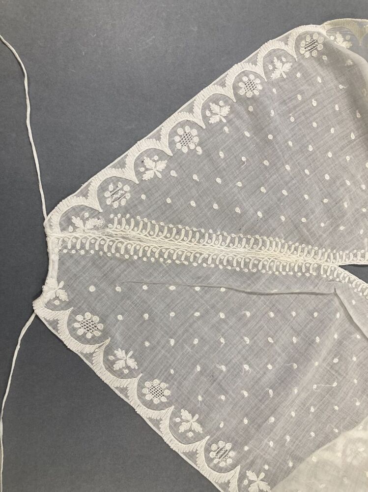 Driehoekige batisten chemisette of kraag, gemaakt van getamboereerde tipdoek met guirlanderand