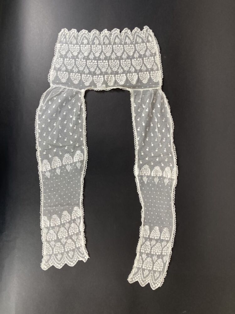 Losse kraag van machinaal geborduurde tule met rechthoekig deel op rug, onderdeel van kostuum