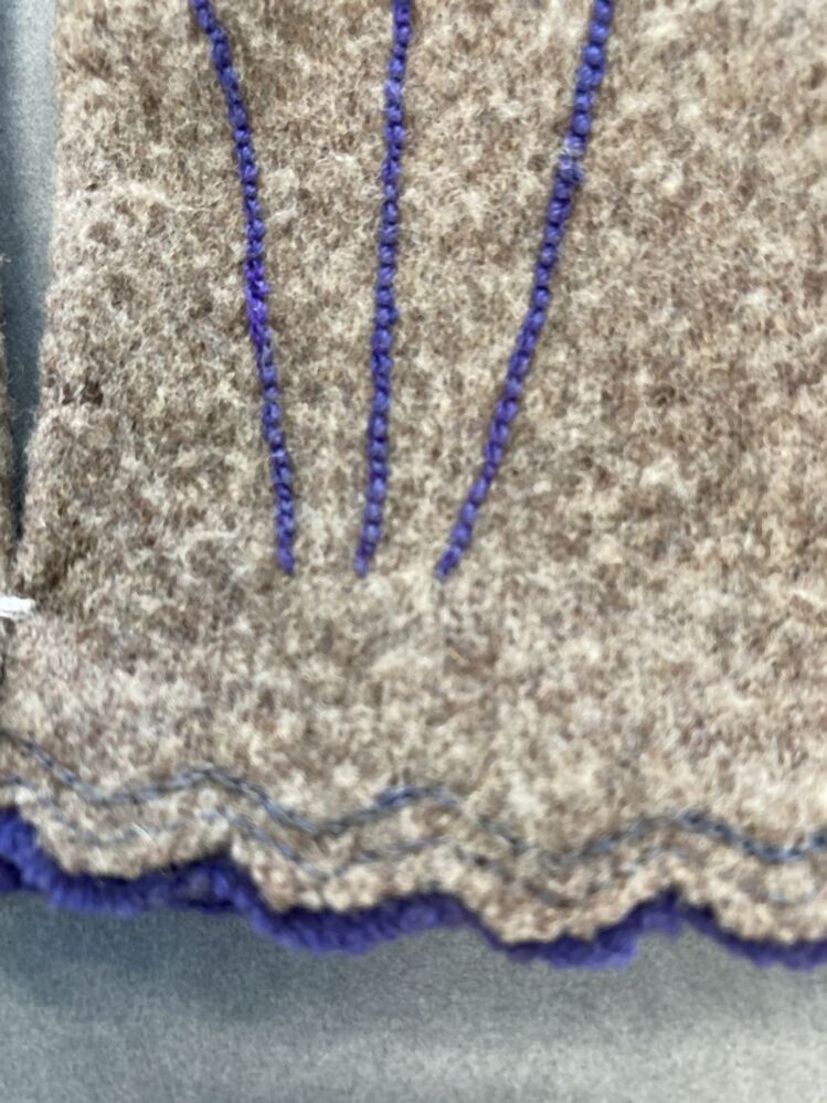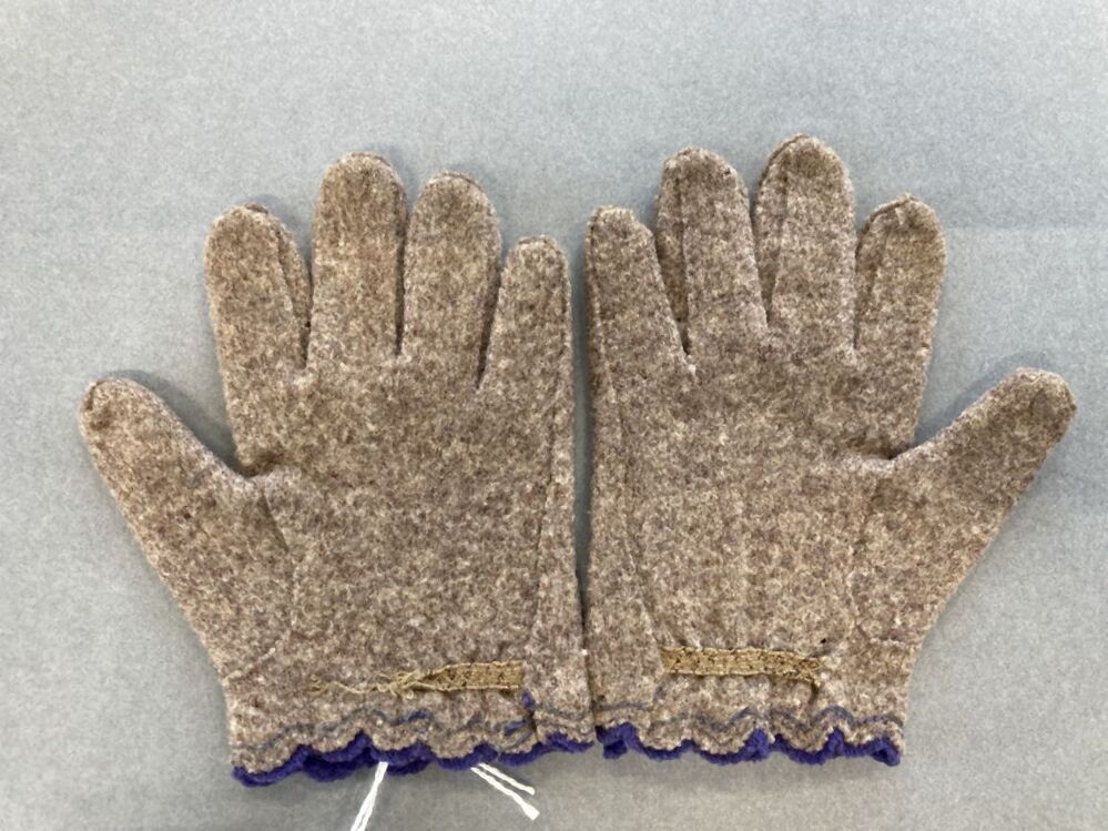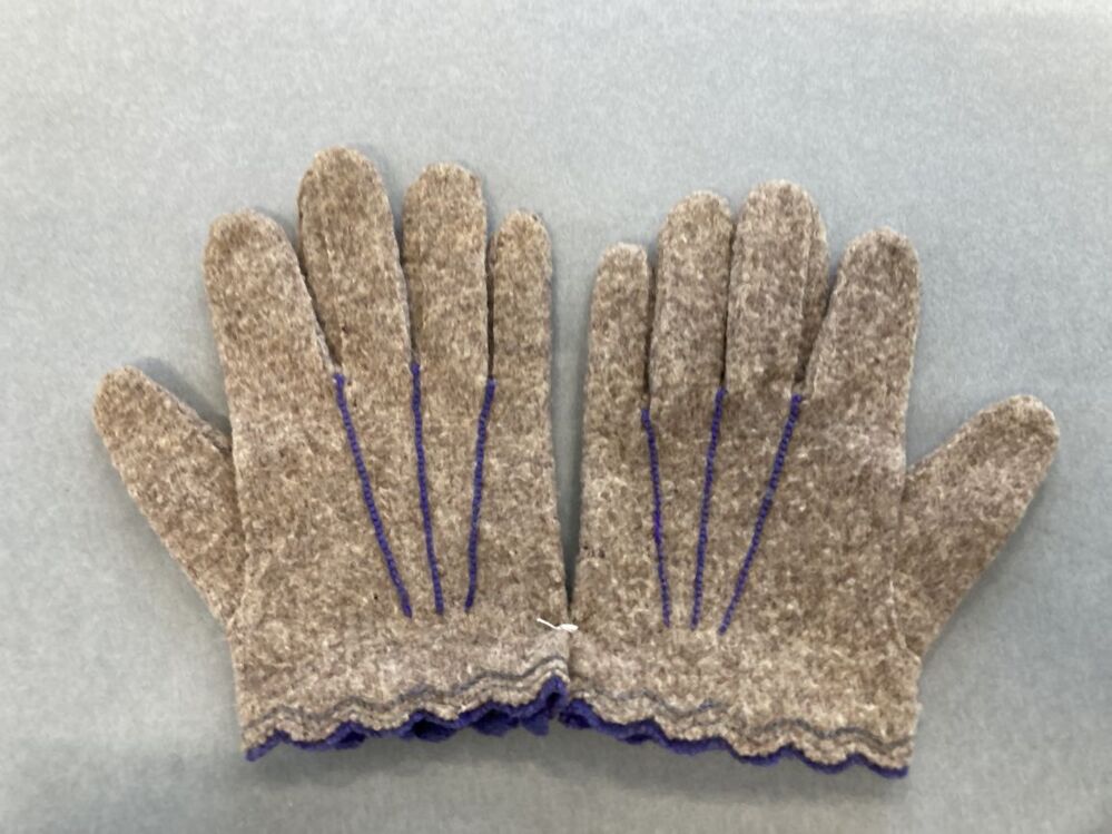Paar grijs-beige kinderhandschoentjes van vervilt wollen tricot, afgewerkt met paars