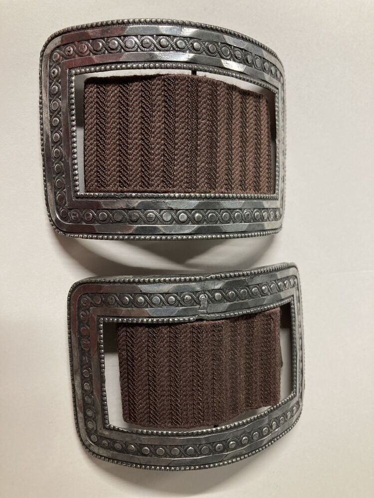 Paar grote zilveren rechthoekige schoengespen aan bruine elastieken band bij feestelijk Fries kostuum