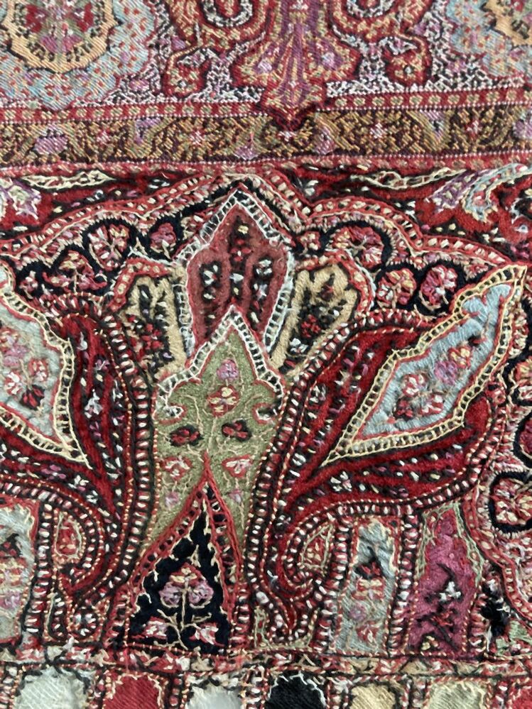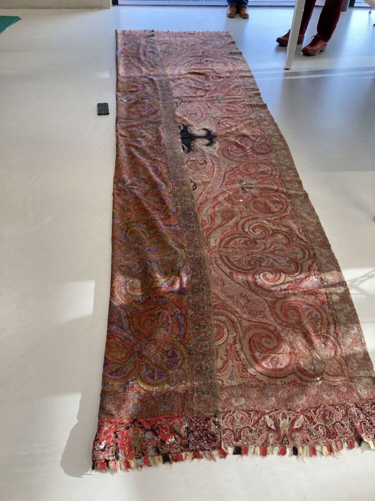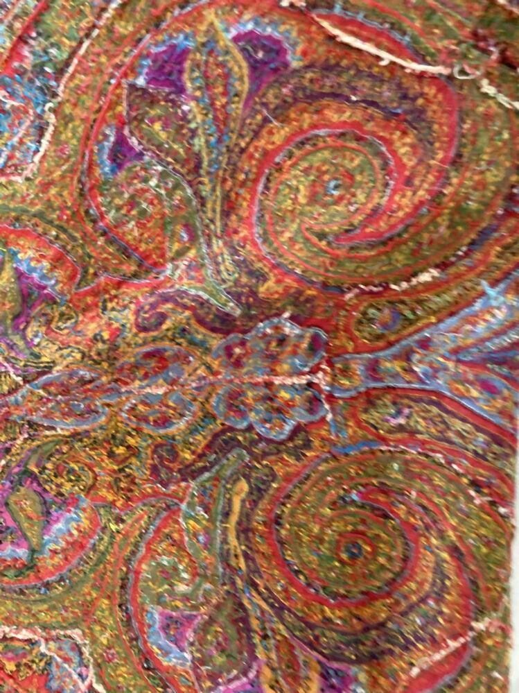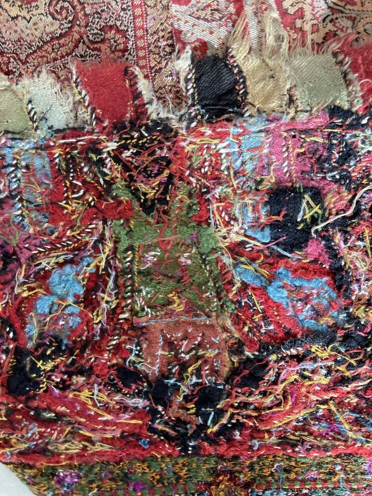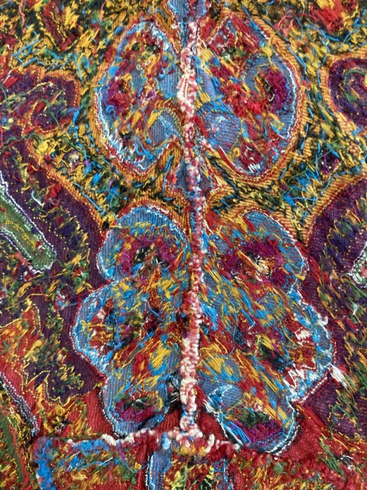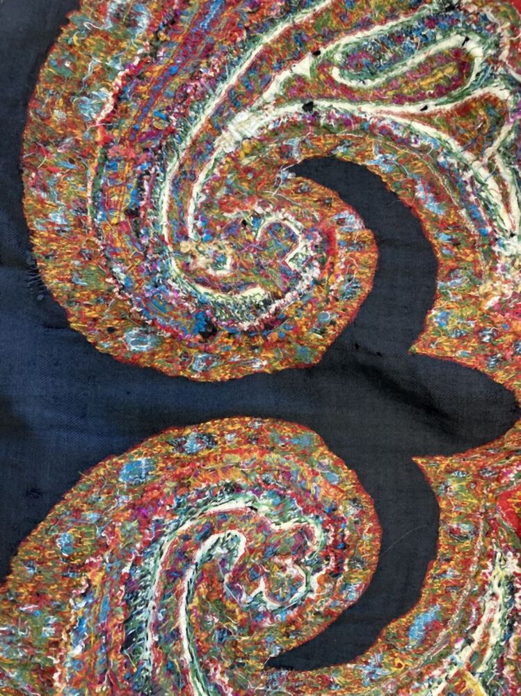 Slingerdoek of kasjmiersjaal, zwarte spiegel en veelkleurig patroon in patchwork techniek