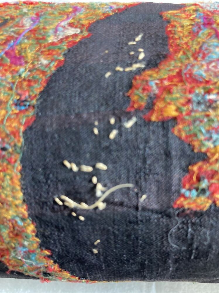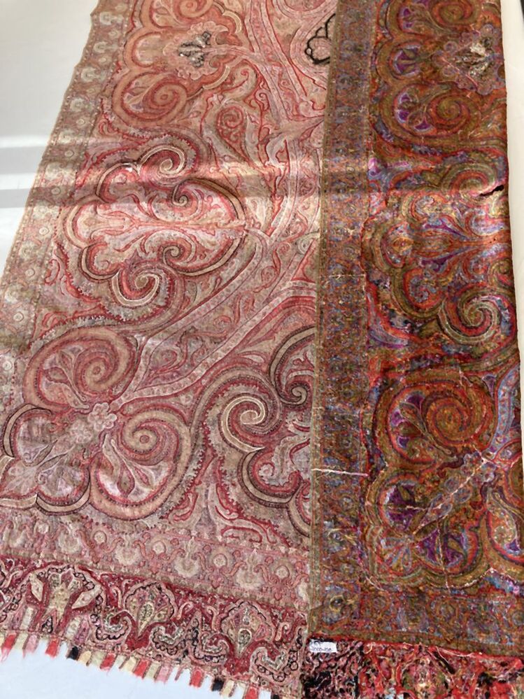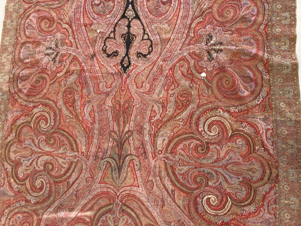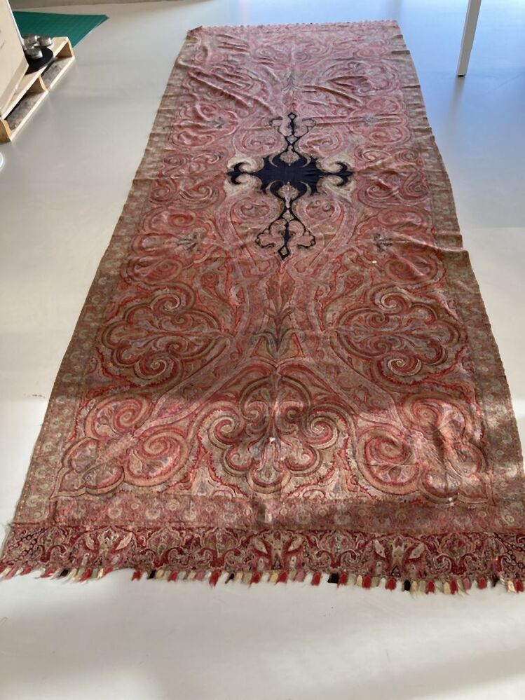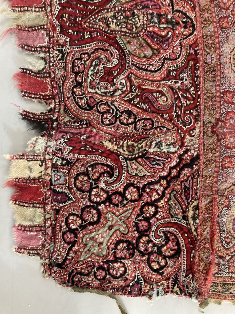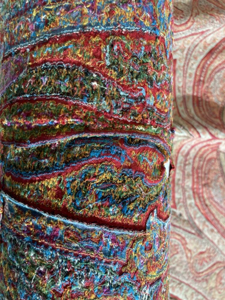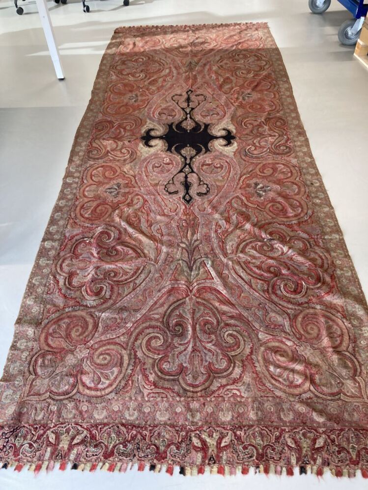 Slingerdoek of kasjmiersjaal, zwarte spiegel en veelkleurig patroon in patchwork techniek
